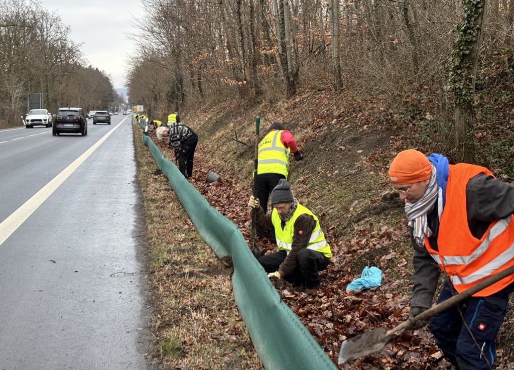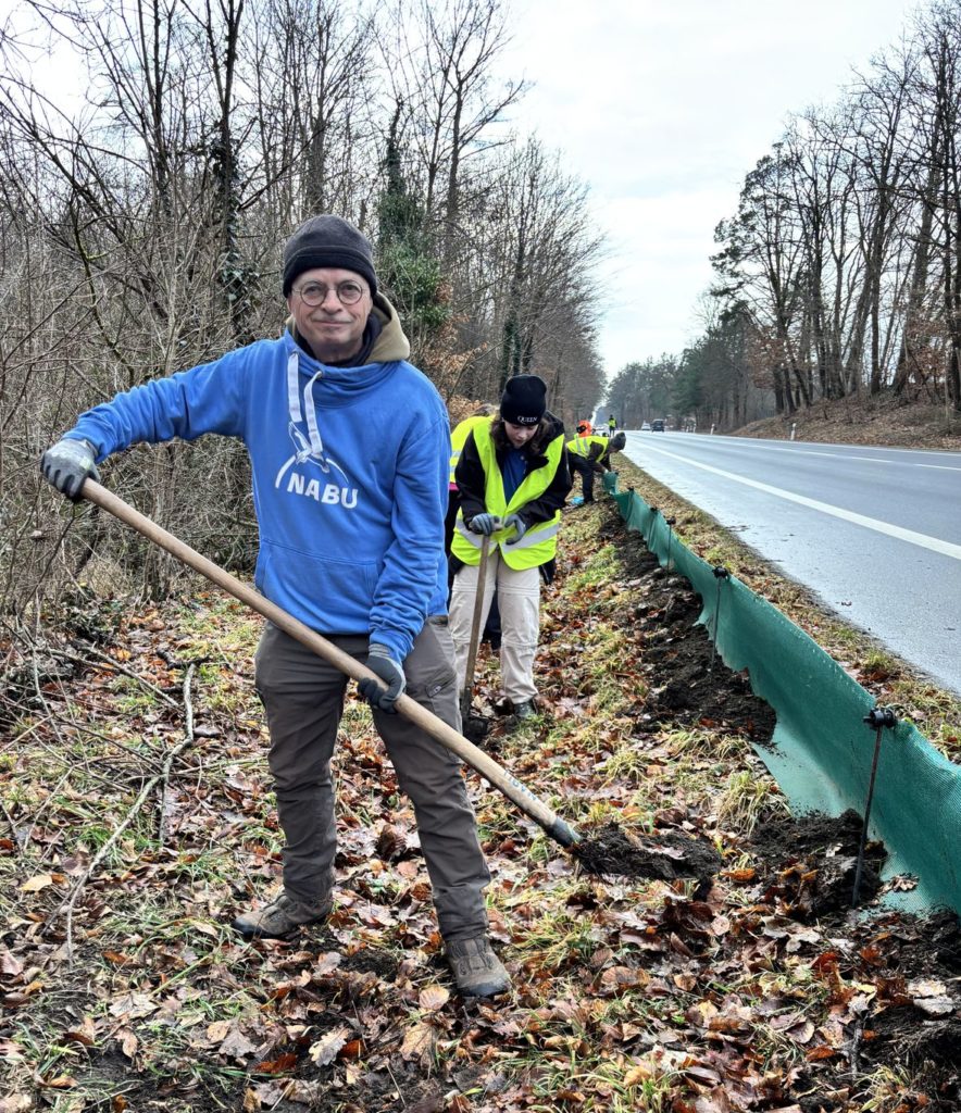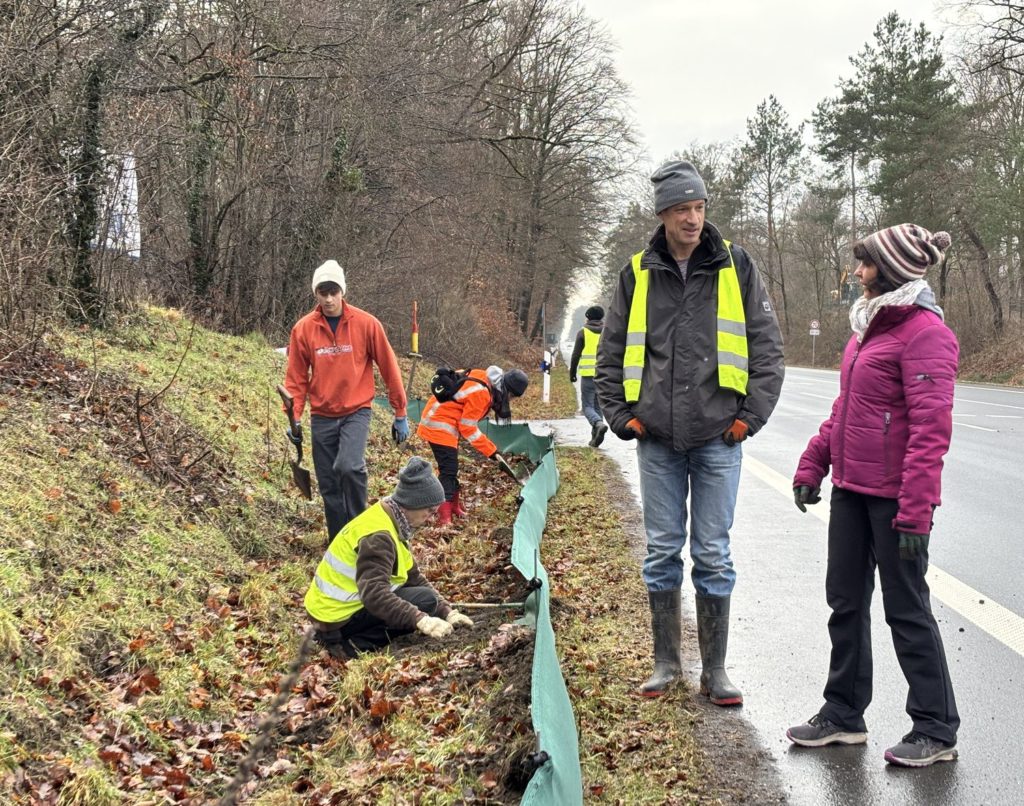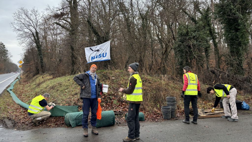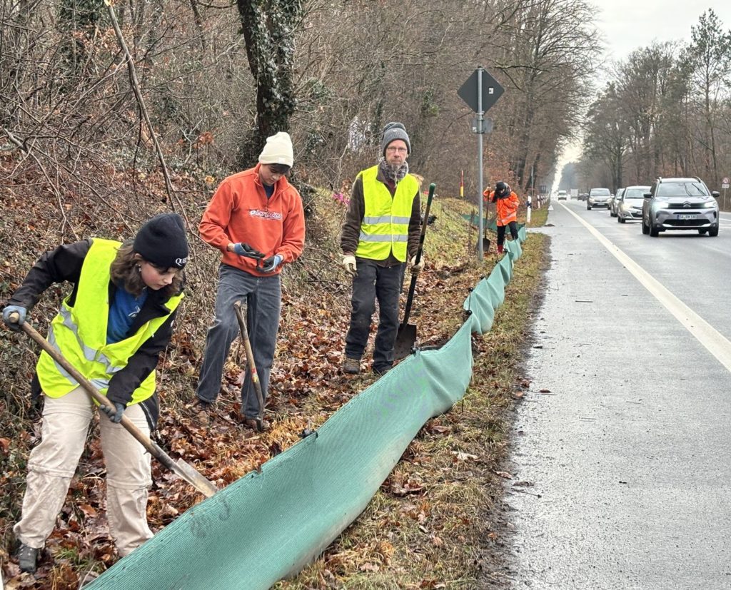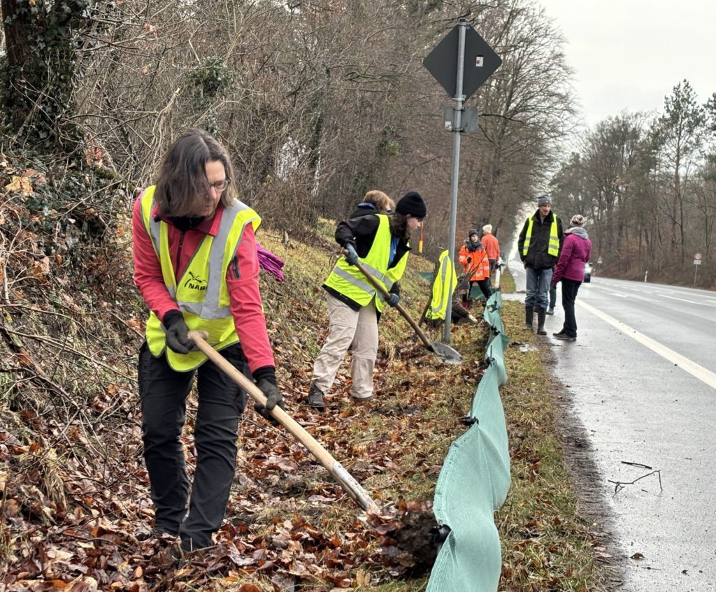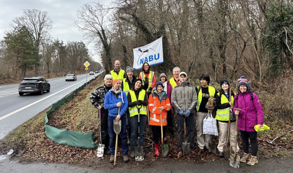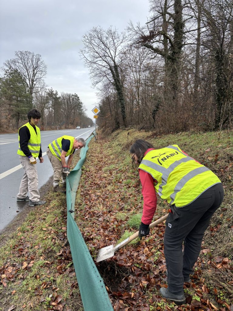 NABU-Aktive gemeinsam mit Schülerinnen und Schülern der Internationalen Schule am Schuldorf Bergstraße errichteten einen 300 Meter langen Amphibienzaun entlang der viel befahrenen B3 im Wald an der Malchener Tanne. Dieser Zaun schützt vor allem Erdkröten vor dem gefährlichen Straßenverkehr, indem die Tiere sicher in Sammelbehälter geleitet und dann von den Aktiven über die Straße gebracht werden.