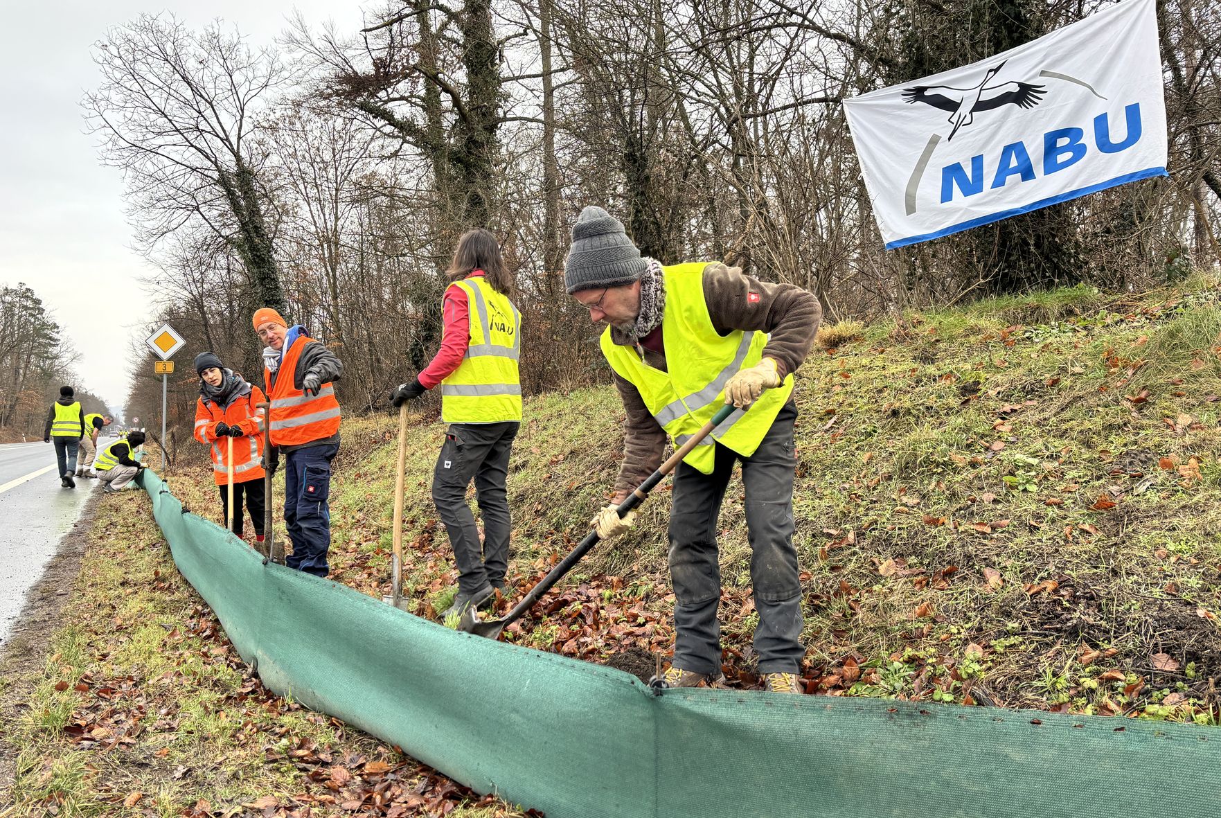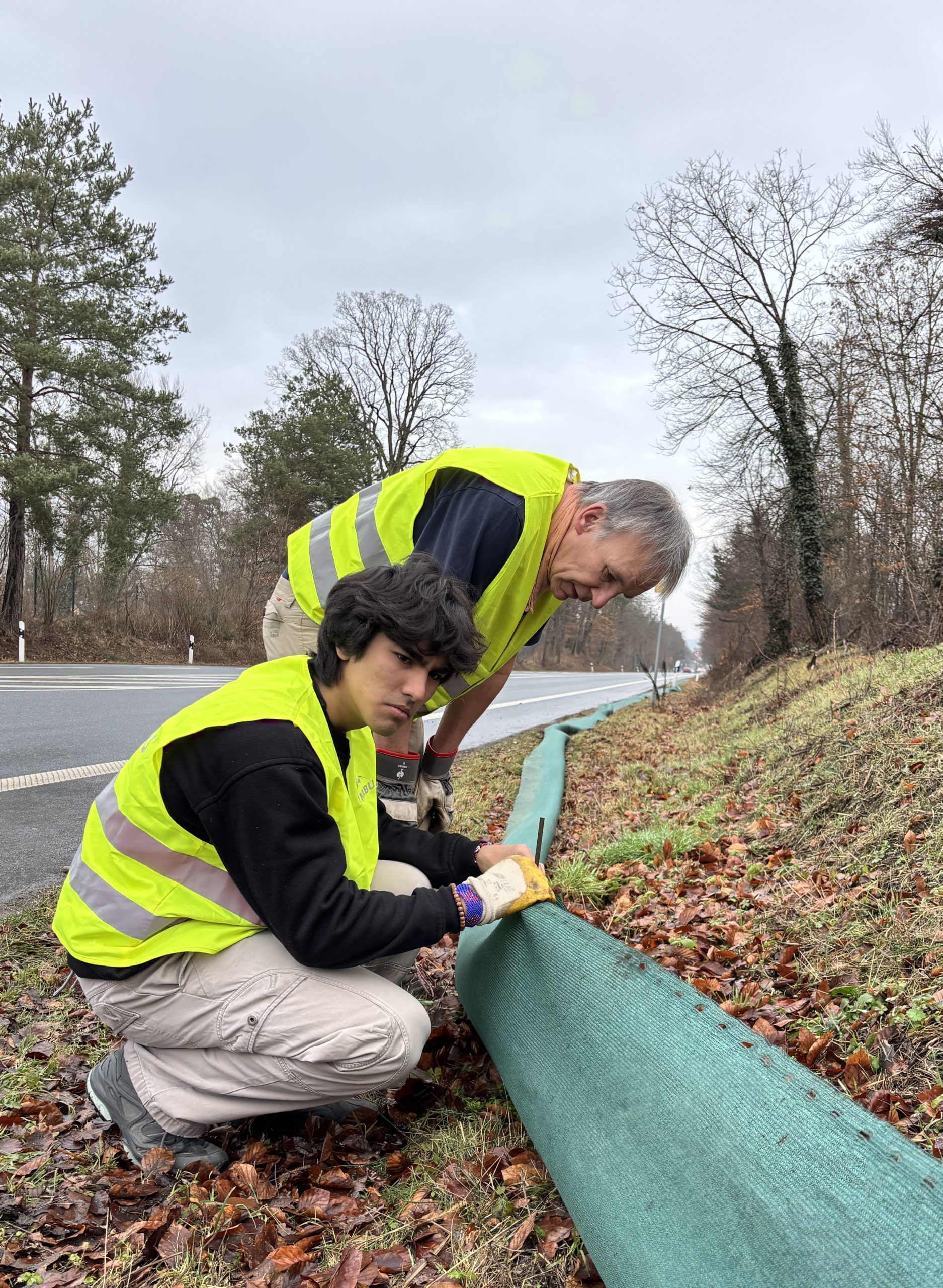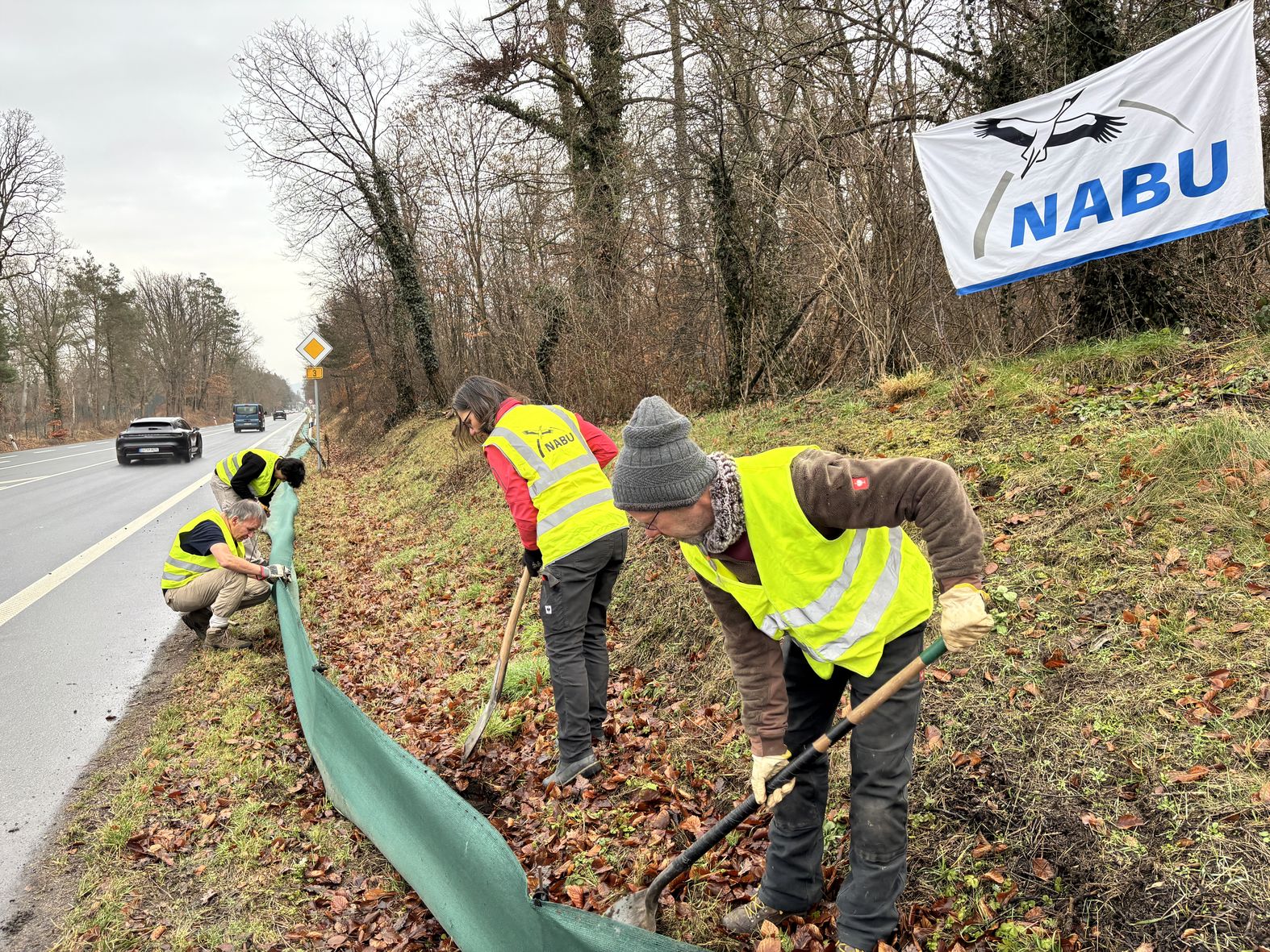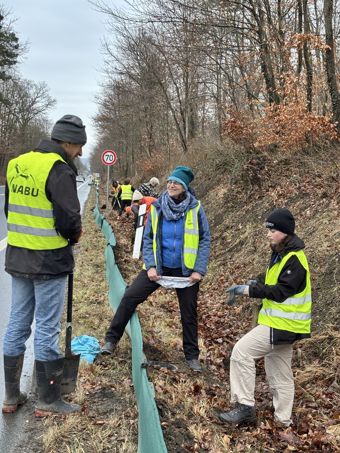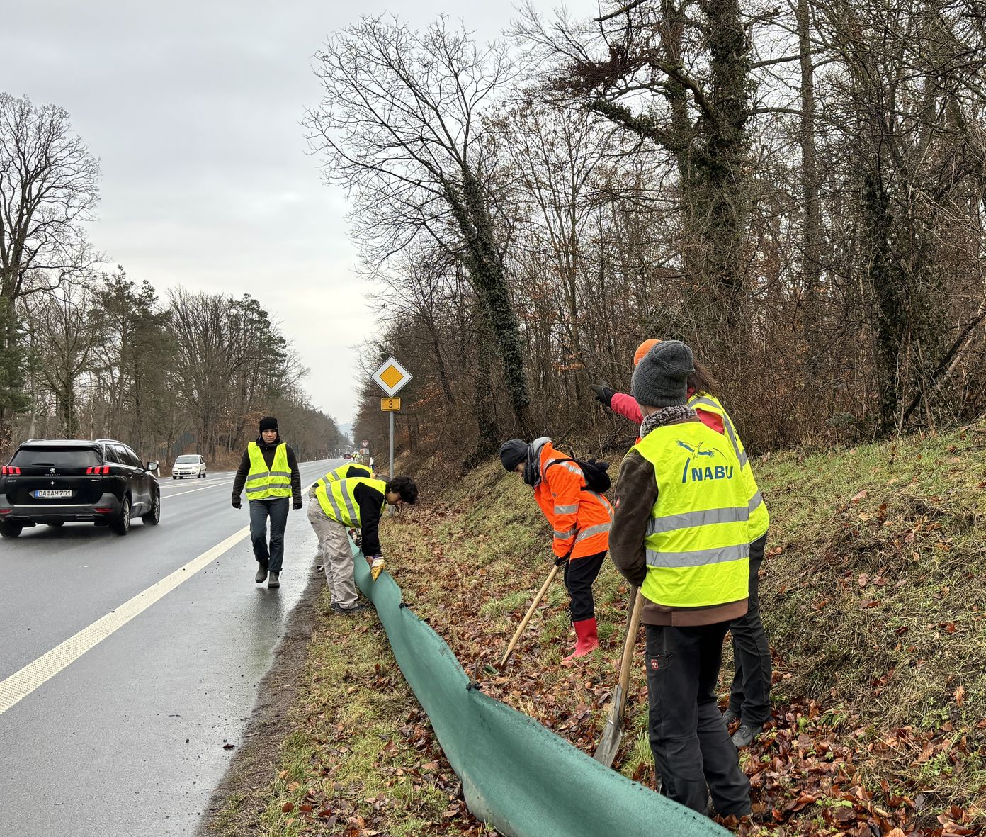 NABU-Aktive gemeinsam mit Schülerinnen und Schülern der Internationalen Schule am Schuldorf Bergstraße errichteten einen 300 Meter langen Amphibienzaun entlang der viel befahrenen B3 im Wald an der Malchener Tanne. Dieser Zaun schützt vor allem Erdkröten vor dem gefährlichen Straßenverkehr, indem die Tiere sicher in Sammelbehälter geleitet und dann von den Aktiven über die Straße gebracht werden.