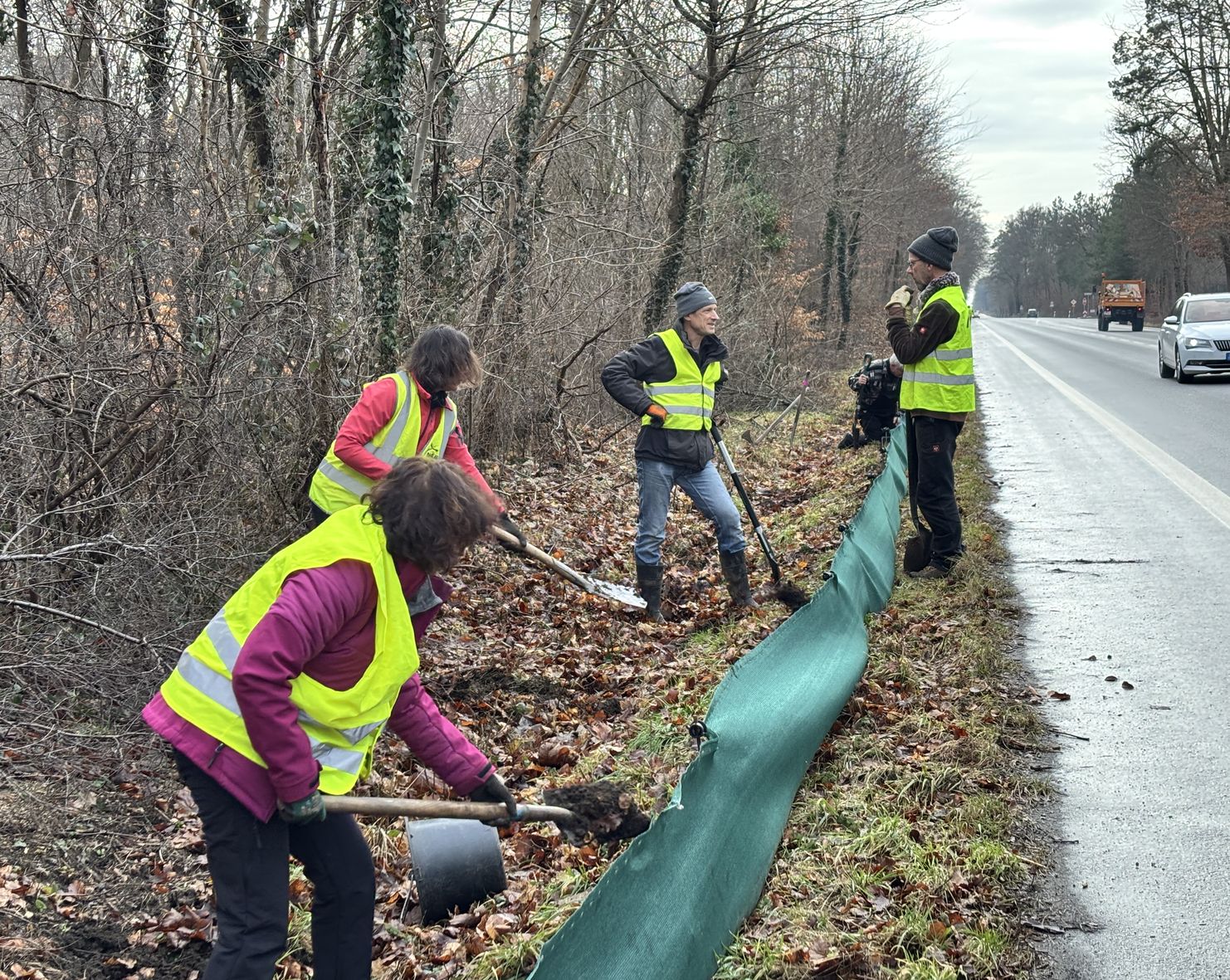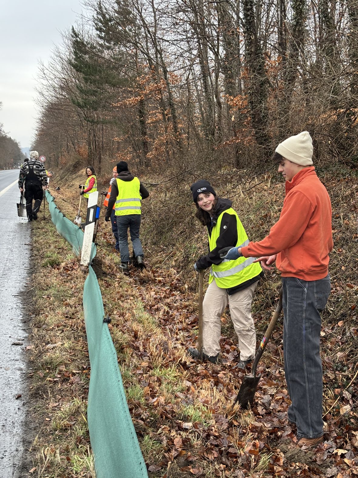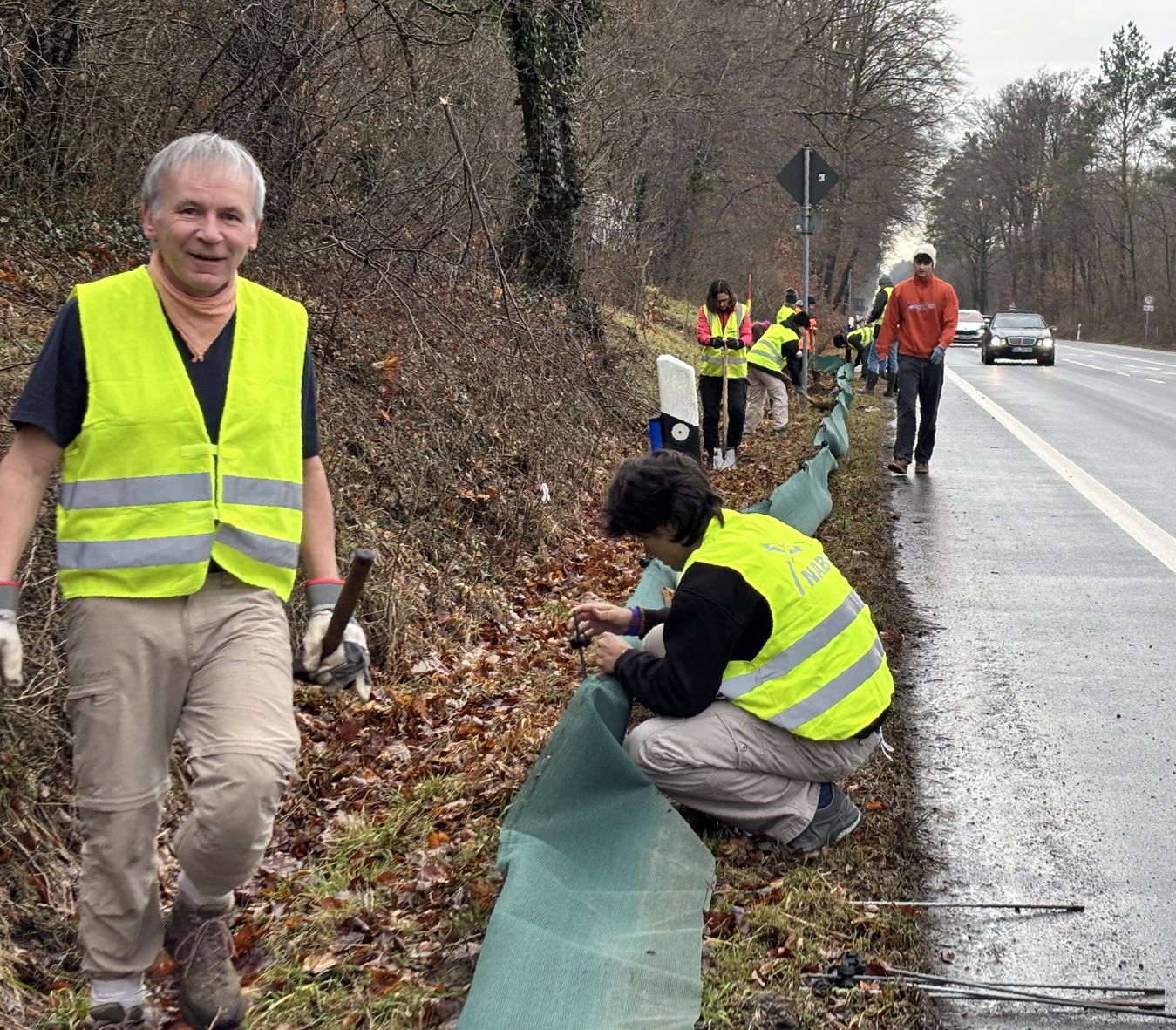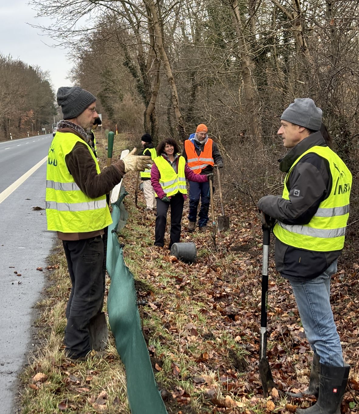 NABU-Aktive gemeinsam mit Schülerinnen und Schülern der Internationalen Schule am Schuldorf Bergstraße errichteten einen 300 Meter langen Amphibienzaun entlang der viel befahrenen B3 im Wald an der Malchener Tanne. Dieser Zaun schützt vor allem Erdkröten vor dem gefährlichen Straßenverkehr, indem die Tiere sicher in Sammelbehälter geleitet und dann von den Aktiven über die Straße gebracht werden.