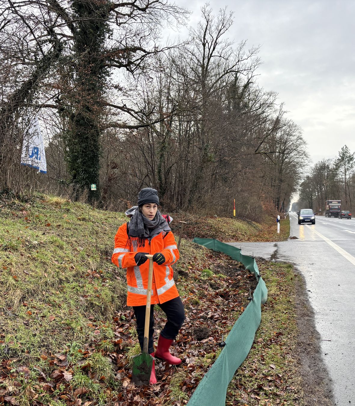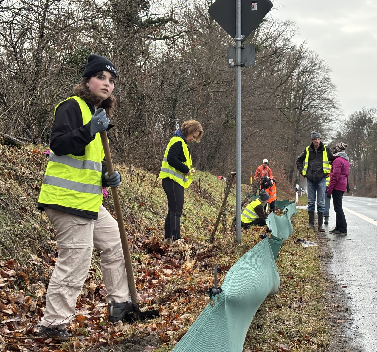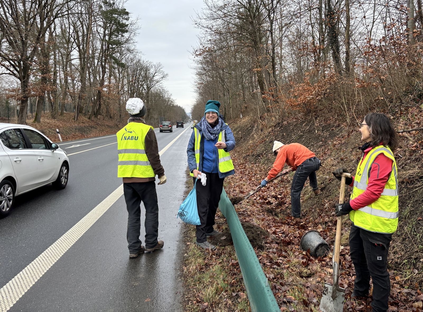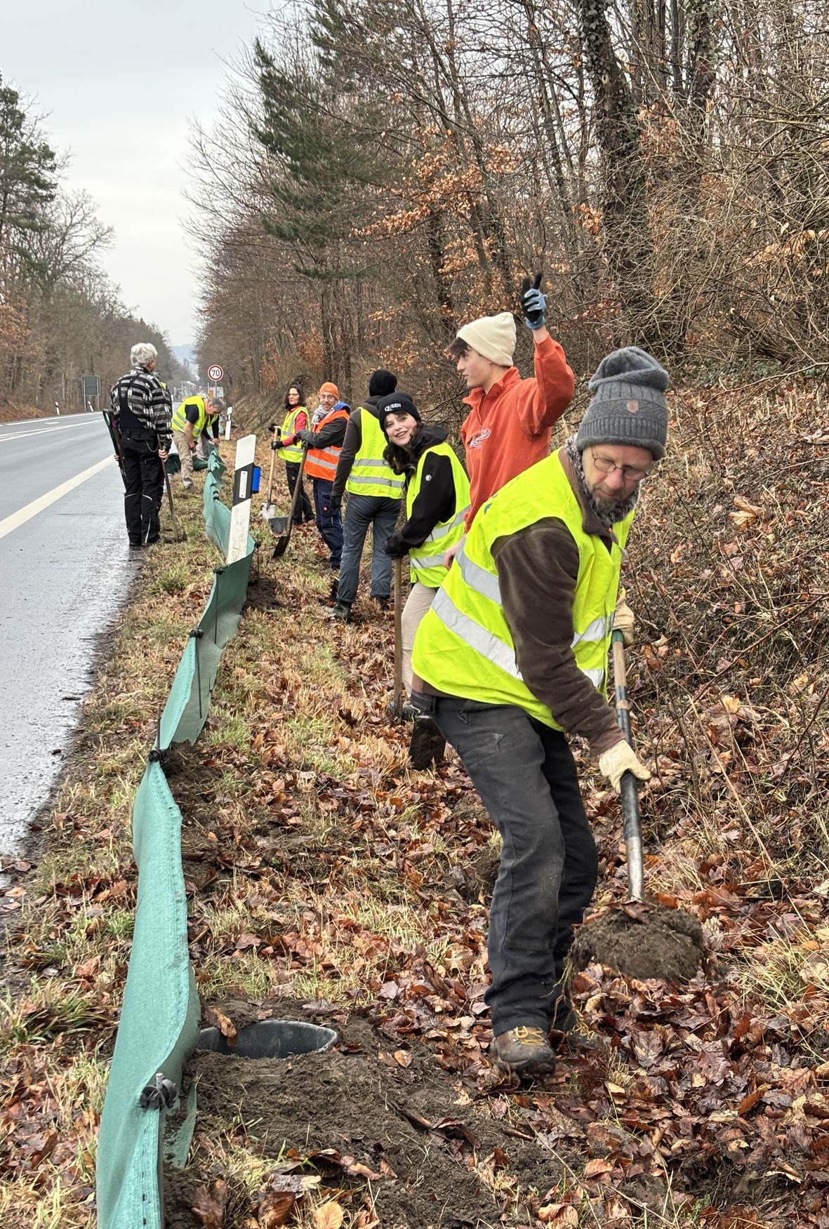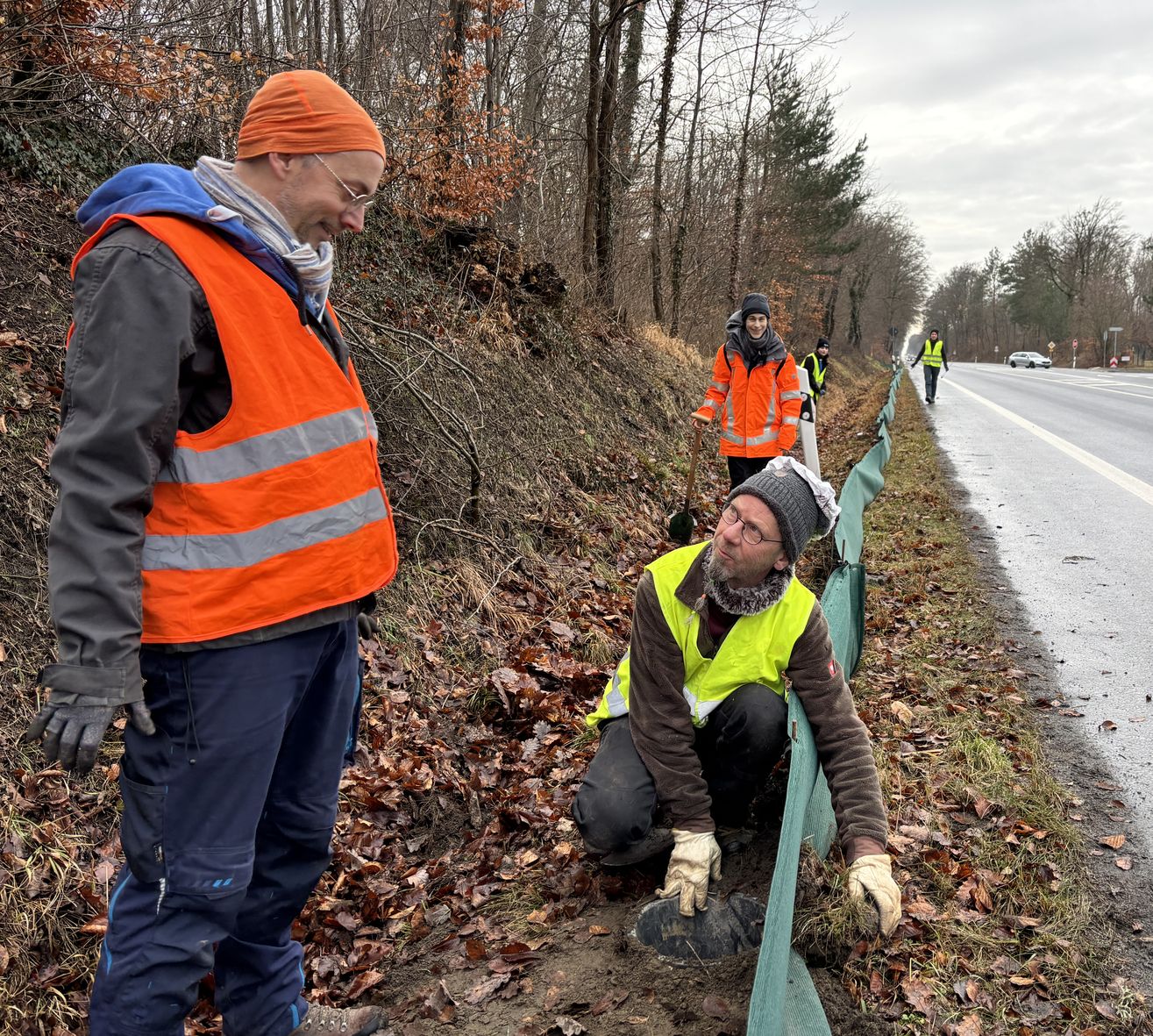 NABU-Aktive gemeinsam mit Schülerinnen und Schülern der Internationalen Schule am Schuldorf Bergstraße errichteten einen 300 Meter langen Amphibienzaun entlang der viel befahrenen B3 im Wald an der Malchener Tanne. Dieser Zaun schützt vor allem Erdkröten vor dem gefährlichen Straßenverkehr, indem die Tiere sicher in Sammelbehälter geleitet und dann von den Aktiven über die Straße gebracht werden.