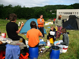 Klaus versucht die Wäsche ein wenig zu trocknen – alles ist klatschnaß vom gestrigen Dauerregen