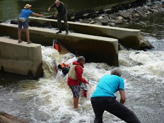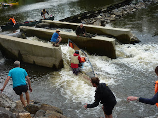 Die anderen Boote kommen problemlos durch. Der Zeltplatz an der Mühle gefällt nicht allen und so fahren wir noch einletztes Stück weiter, obwohl es schon Abend wird.