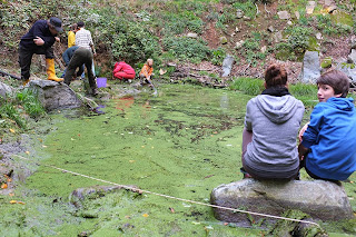 Nachdem die ersten Anzeichen des Frühlings kommen, die ersten Wülmäus-Bienen fliegen, werden auch bald die Frösche, Molche und Salamander die Teiche bevölkern. Da der Wassersteinbruch schon gerichtet ist, der Wühlmäus-Weiher von den Feuersalamandern erst vor kurzem entschlammt wurde, war jetzt der Dornbachteich an der Reihe. Da wir letzte Woche schon angefangen hatten, ging es diesmal relativ schnell. Wir hatten einen größeren Schlauch besorgt, da er aber so stark sog, mussten wir uns etwas einfallen lassen. Eine komplizierte, von Eckie ausgetüftelte Erfindung musste her. Jetzt konnten wir oben weniger Wasser reinlassen, ohne das Luft in den Schlauch kommt. Nachdem diese Sache geklärt wurde, konnte es nun endlich ans Ausgraben gehen. Mit vereinten Kräften wurde der Teich von dem restlichen Schlamm und den Blättern befreit.