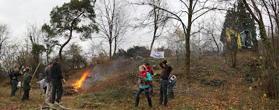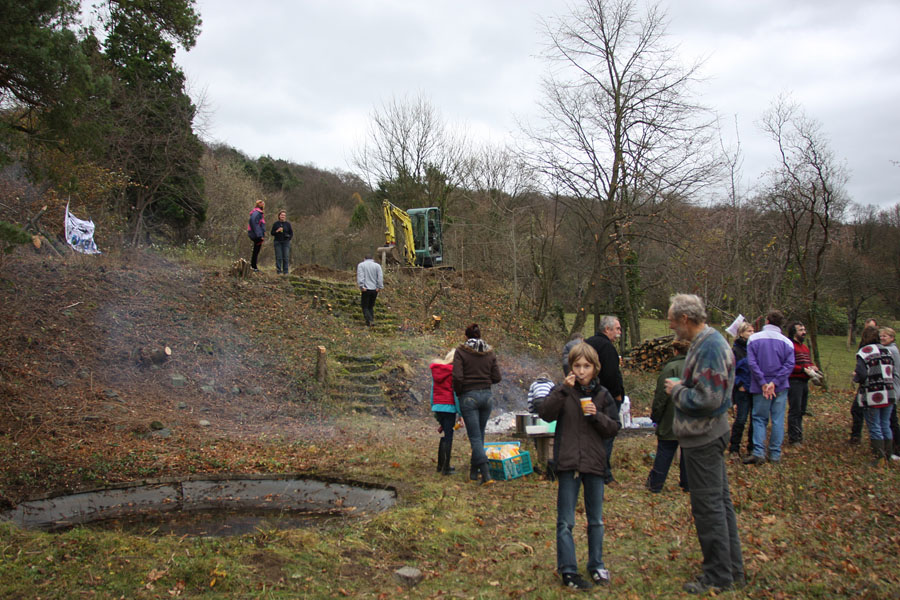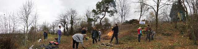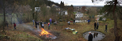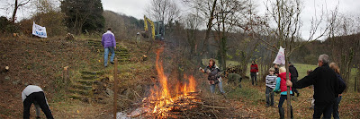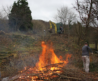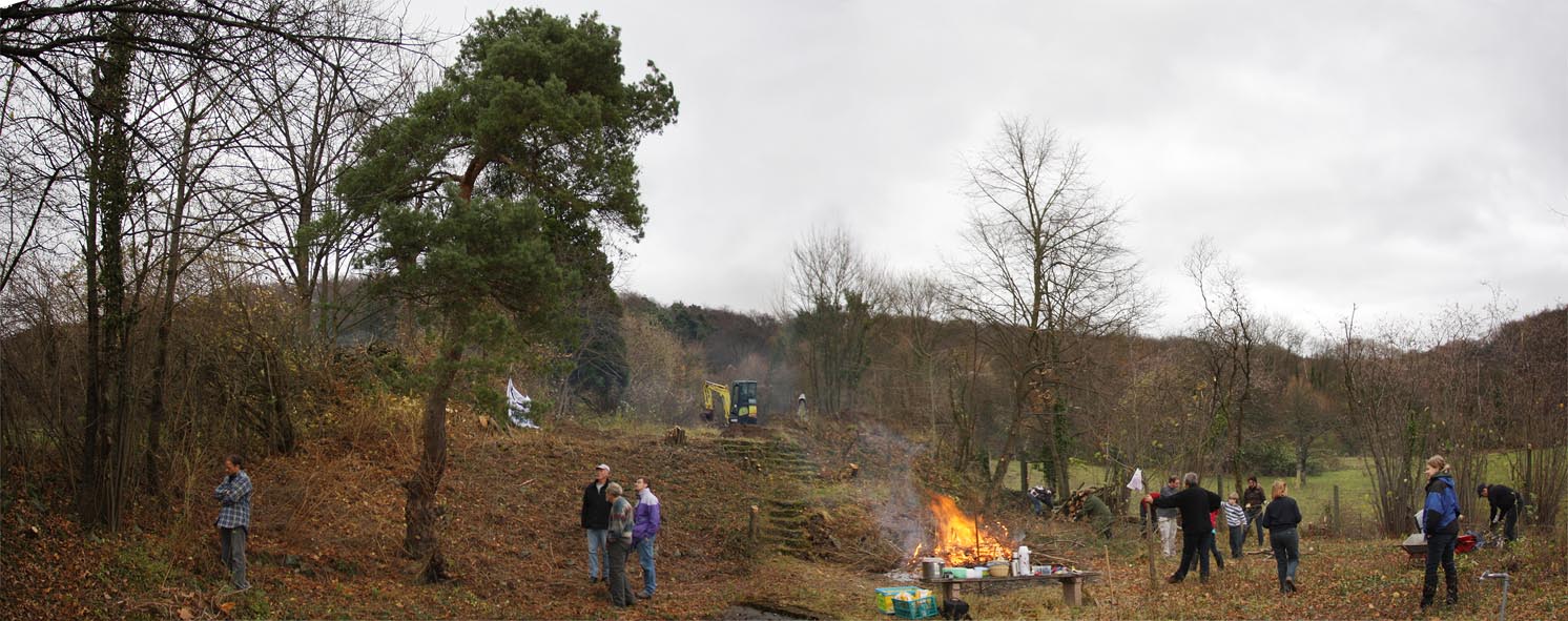 Der Abraum wird auf dem Grundstück verteilt und die Böschung angelegt, während im unteren Bereich das Feuer endlich effektiv von der gewachsenen Helferschar gefüttert werden kann.
