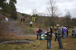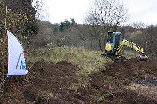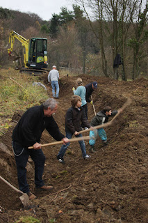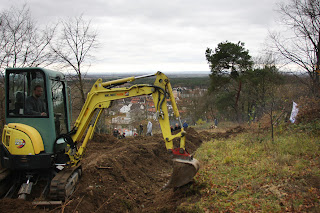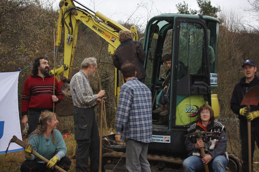 Auf dem NABU Grundstück fängt Steffen als bewährter Baggerfahrer das Fundament der Steinschüttung zu baggern an: der Graben soll einen Meter tief in den Boden reichen und so geneigt sein, das das Wasser frei abfließen kann.