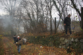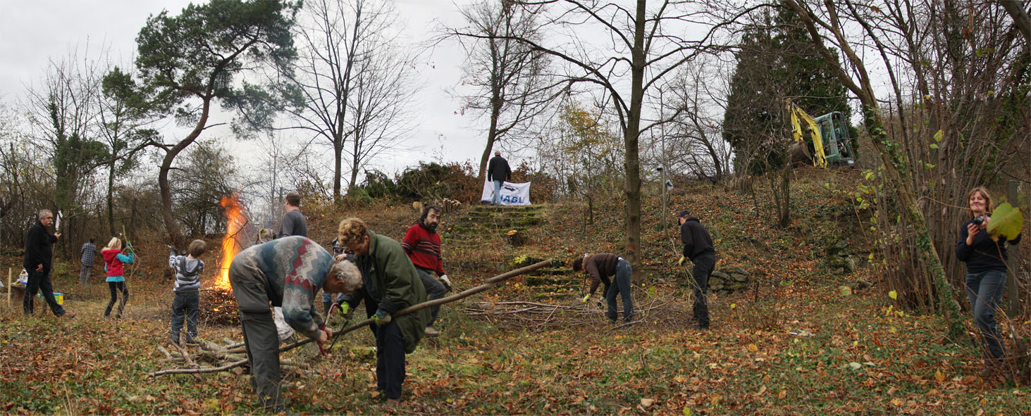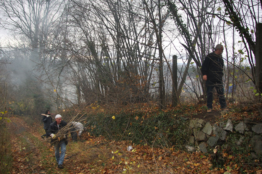 Auf der Pflegefläche werden Hainbuchen, Weissdornbüsche und diverse Sträucher, die die vorhandenen Trockenmauern beschatten, entfernt und gleich vor Ort verbrannt.