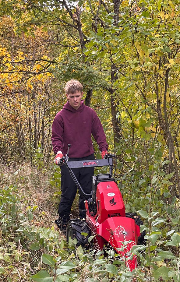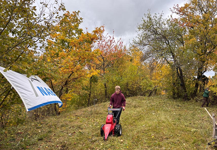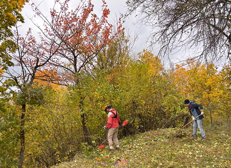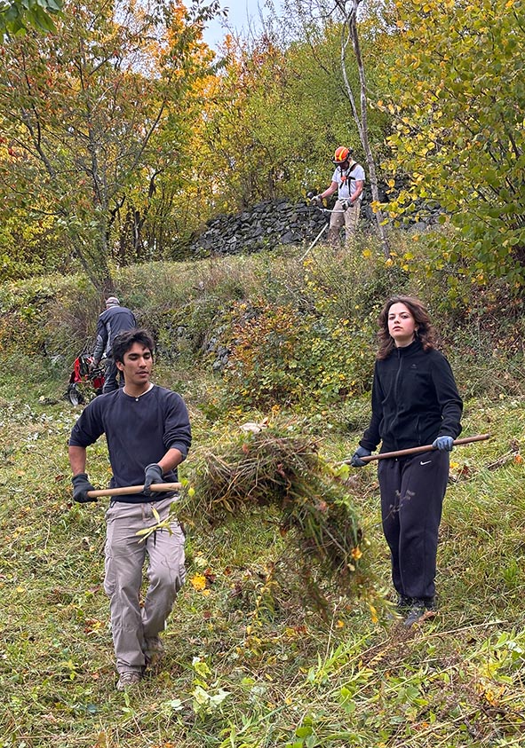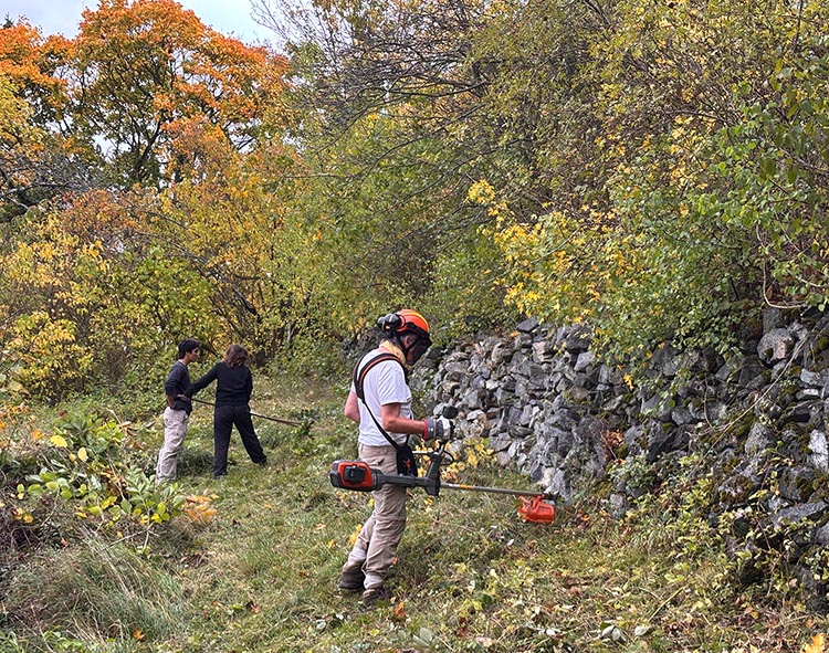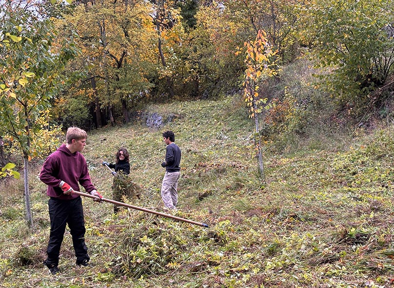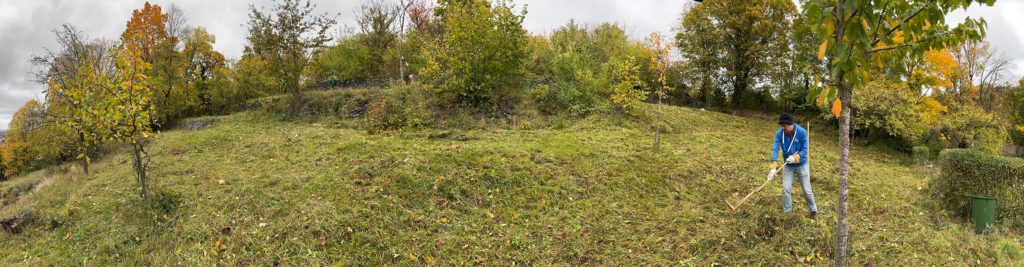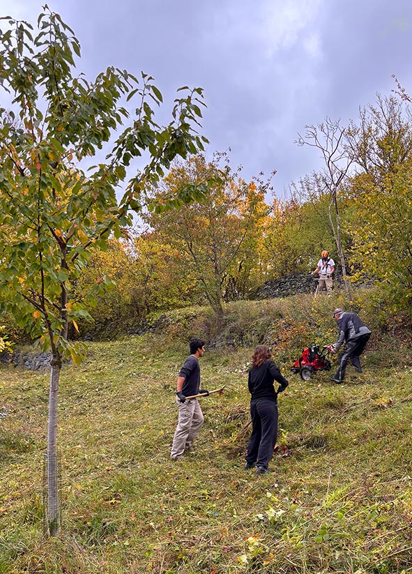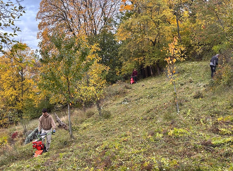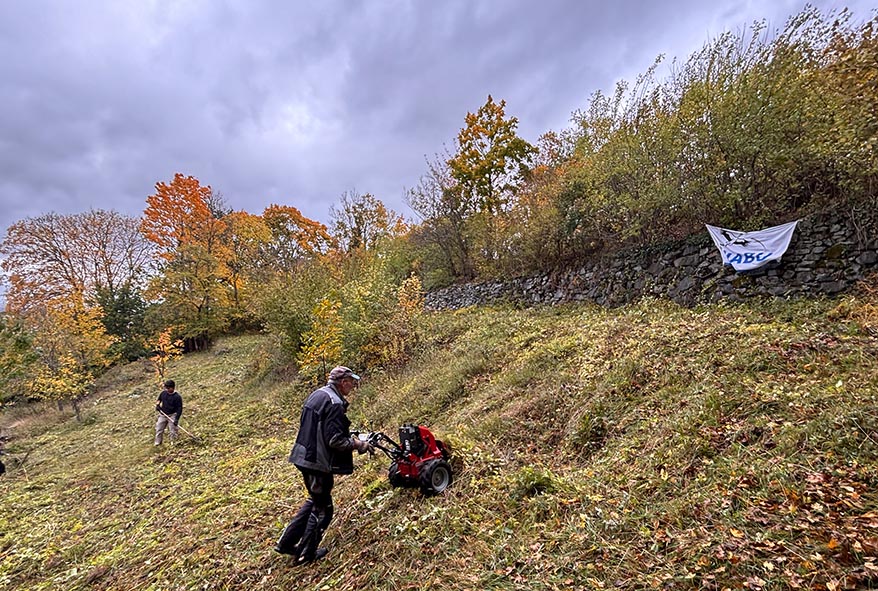 Die Arbeiten beginnen auf der obersten Ebene des Weinbergs: eine Steinschüttung wird von Bewuchs befreit, die Wiese wird gemäht und abgeharkt.