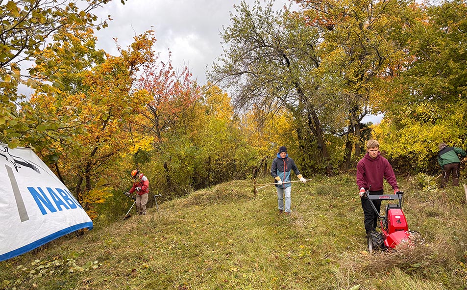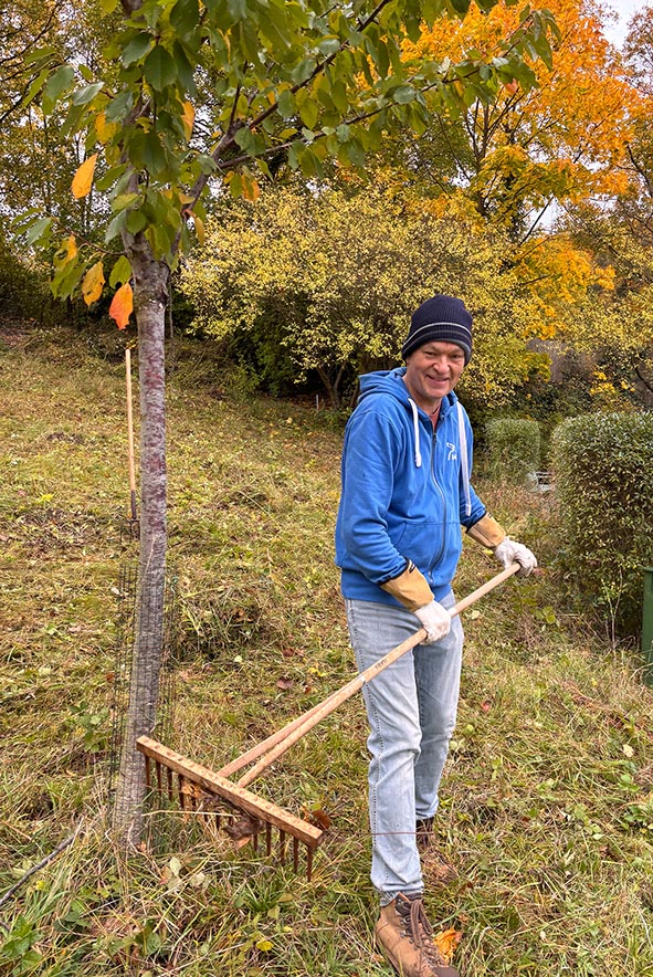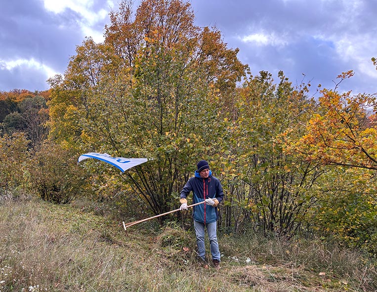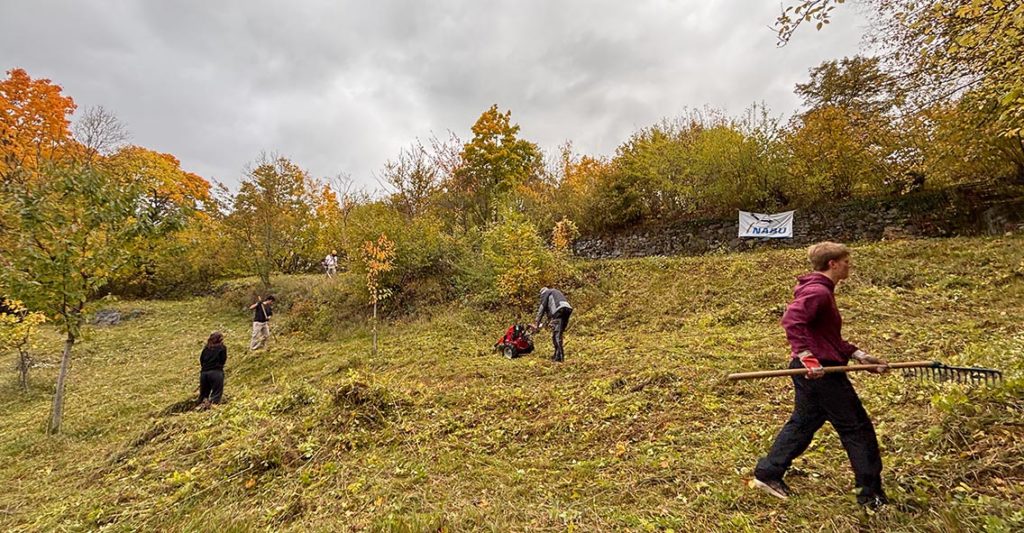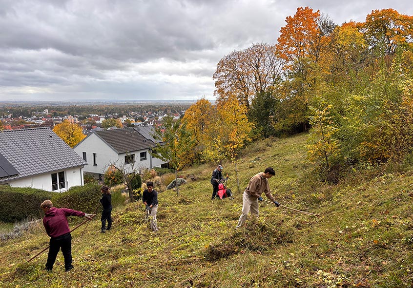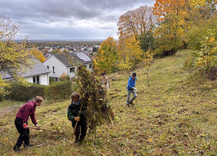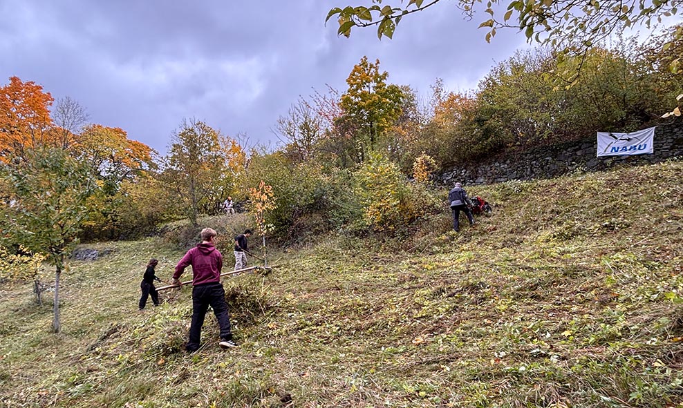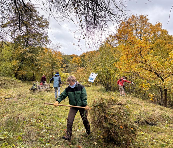 Wegen der ausgefallenen Beweidung durch unsere Schafe muss dieses Mal besonders viel Pflanzenmaterial von der Fläche gebracht werden. Das schaffen wir aber gut, weil viele Helferinnen und Helfer da sind.