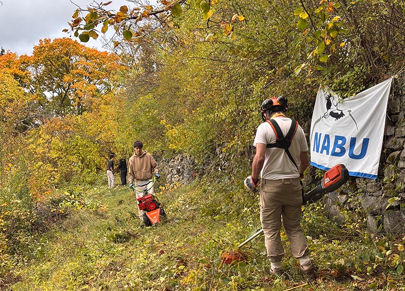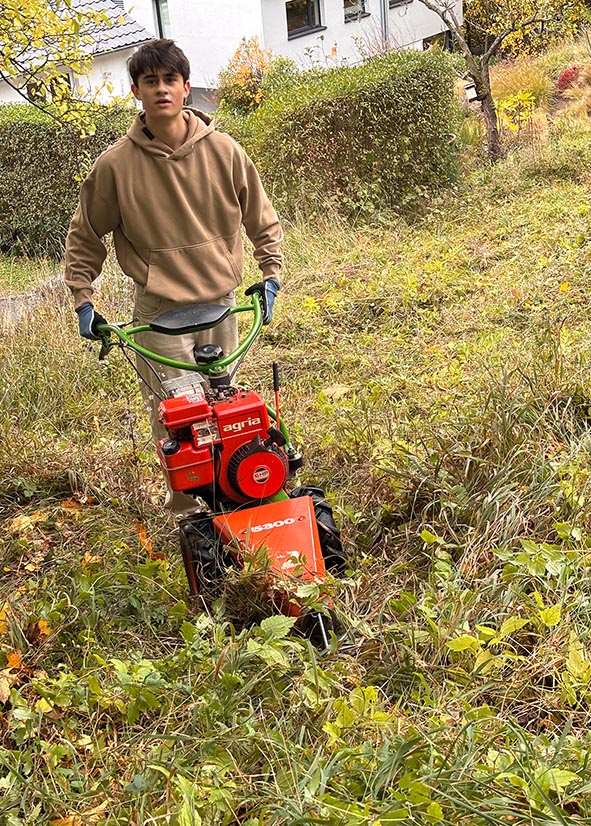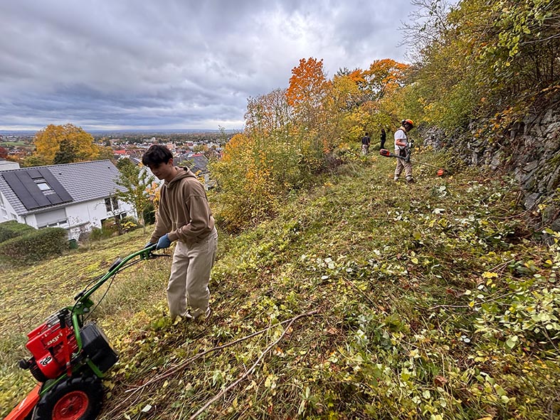 Die Wiesen auf den einzelnen Terrassen werden gemäht, dazu müssen mit vereinten Kräften die beiden Balkenmäher die steilen Weinbergtreppen heruntergetragen werden. Außerdem werden die Trockenmauern von Bewuchs befreit. Das ging diesmal schnell, weil Brombeeren und anderes durch die regelmäßige Entfernung in den Vorjahren langsam zurückgedrängt werden.