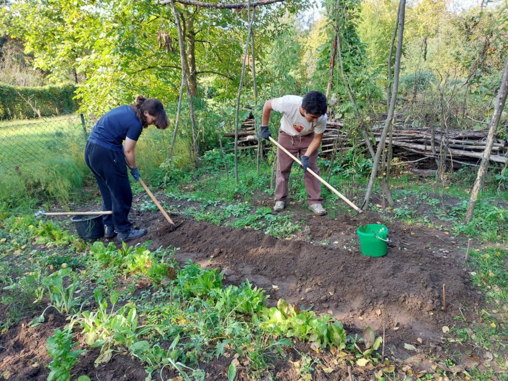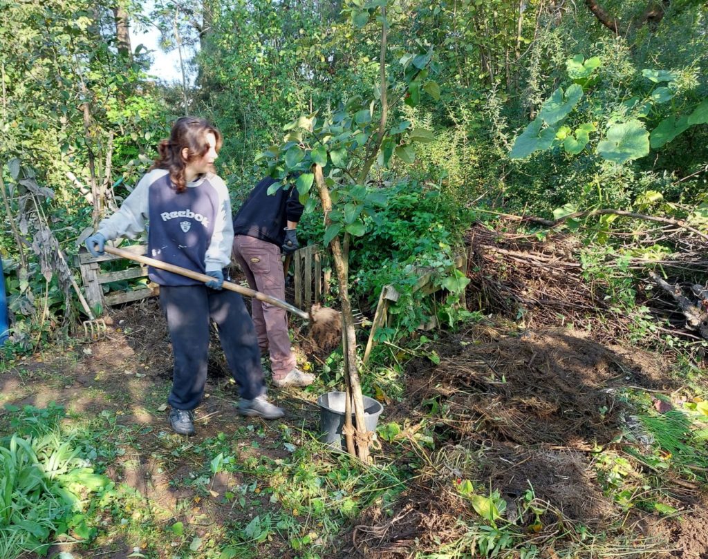 Die anstrengendste Aufgabe, eine neue Kompostmiete aufzusetzen, übernahmen mit Kraft und Ausdauer Rosie und und Emil von der Internationalen Schule Bergstrasse.
