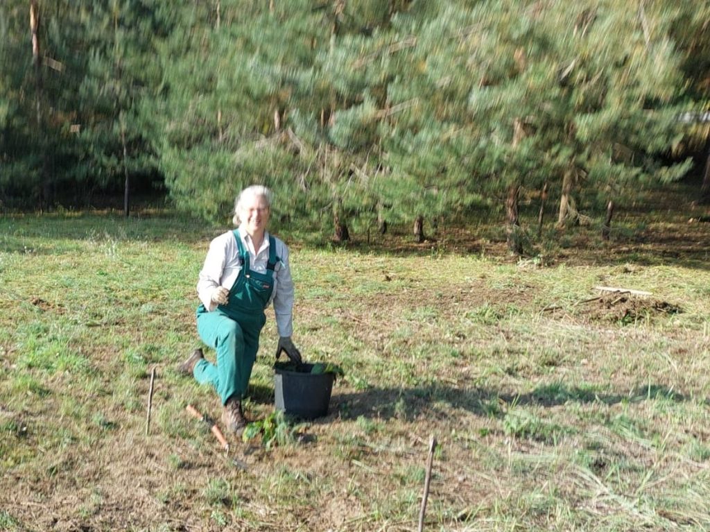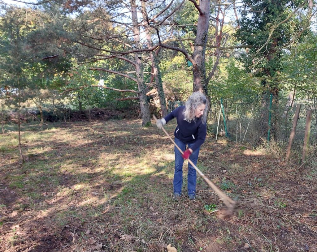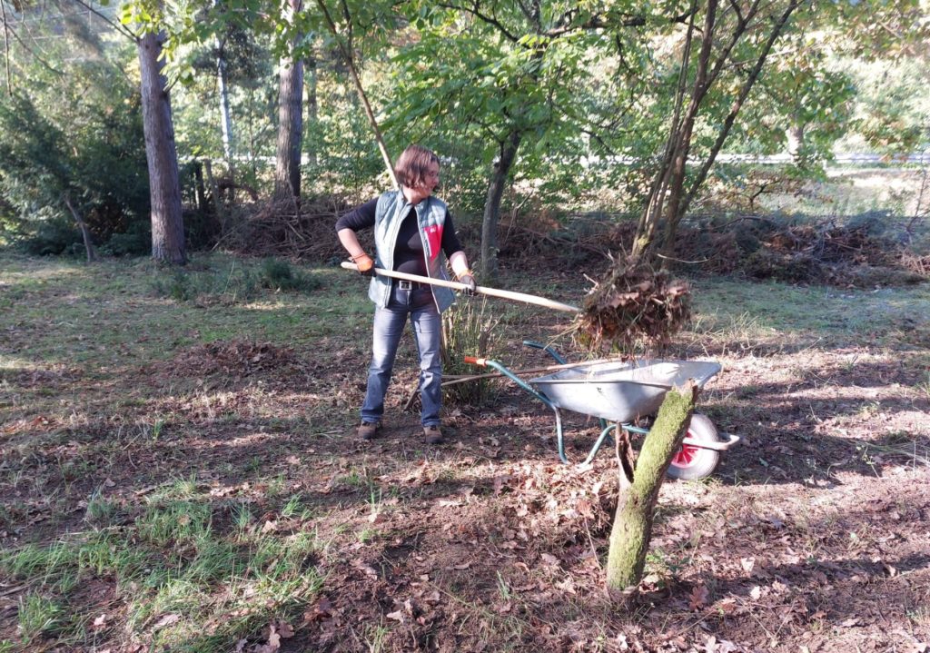 Heike, Hemma und Klaus rechten Mähgut von der Wiese und im Wäldchen ab, so dass sich in die abgemagerten Flächen Wald- und Wiesenblumen ansiedeln können.