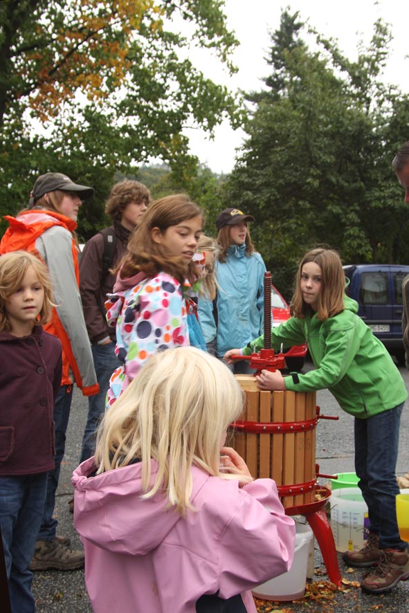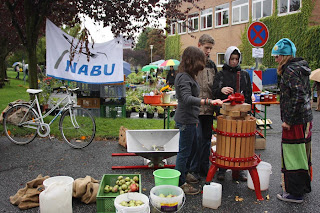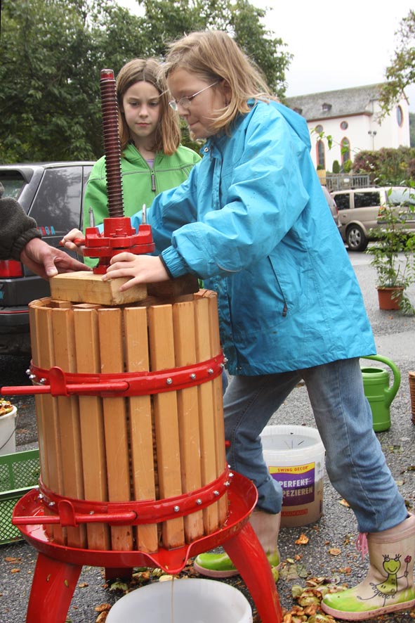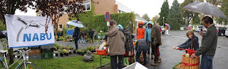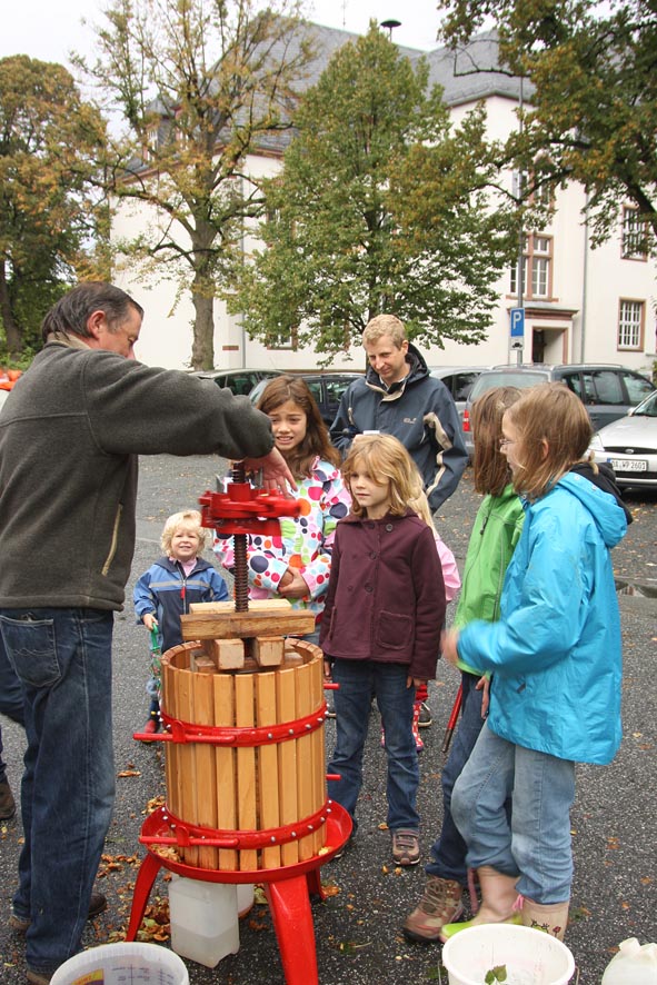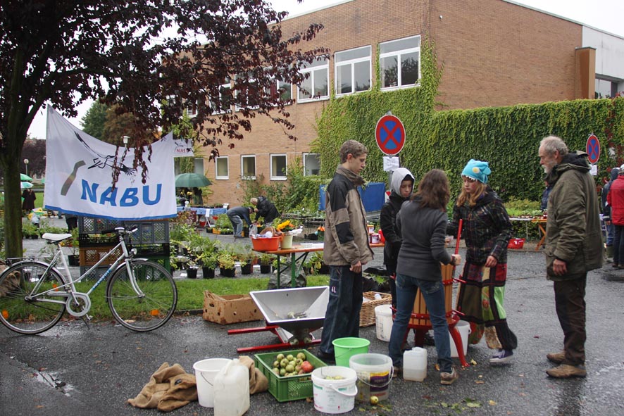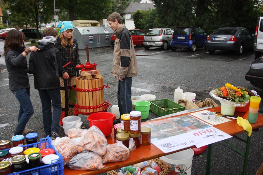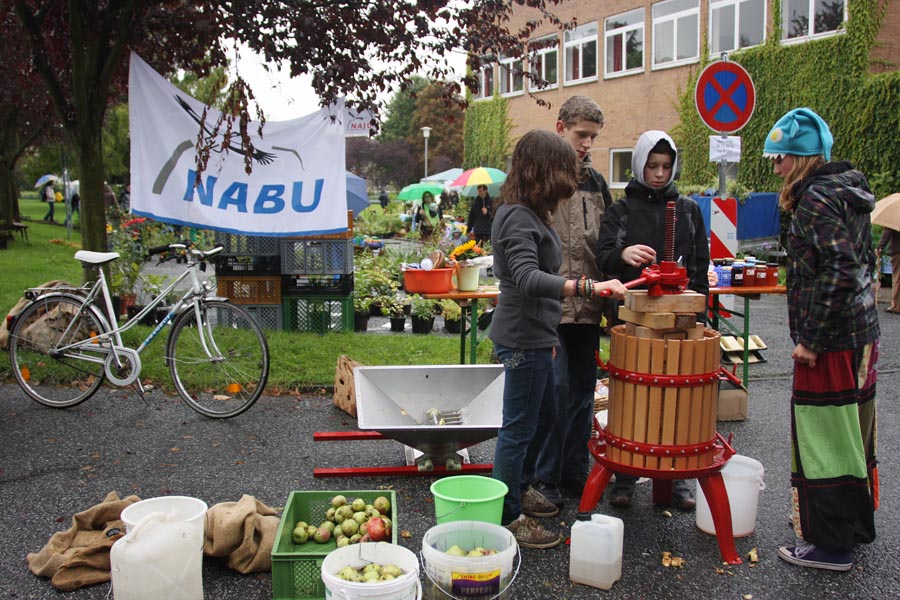 Die Kinder- und Jugendgruppe des NABU „Die Wühlmäuse“ präsentiert sich beim Pflanzenflohmarkt in Seeheim. Frisch gepresster Apfelsaft wird angeboten und auch der berühmte „Wühlmaus-Honig“ der Jung-Imker der Gruppe.