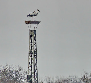 Das Storchenpaar suchte auf den Ackerflächen am nordwestlichen Rand der Landbachaue und an den Rändern der Wasserflächen nach Nahrung. Zwischendurch wurde immer wieder die Nisthilfe auf dem Gittermast des NABU Pfungstadt für eine kurze Rast angeflogen.