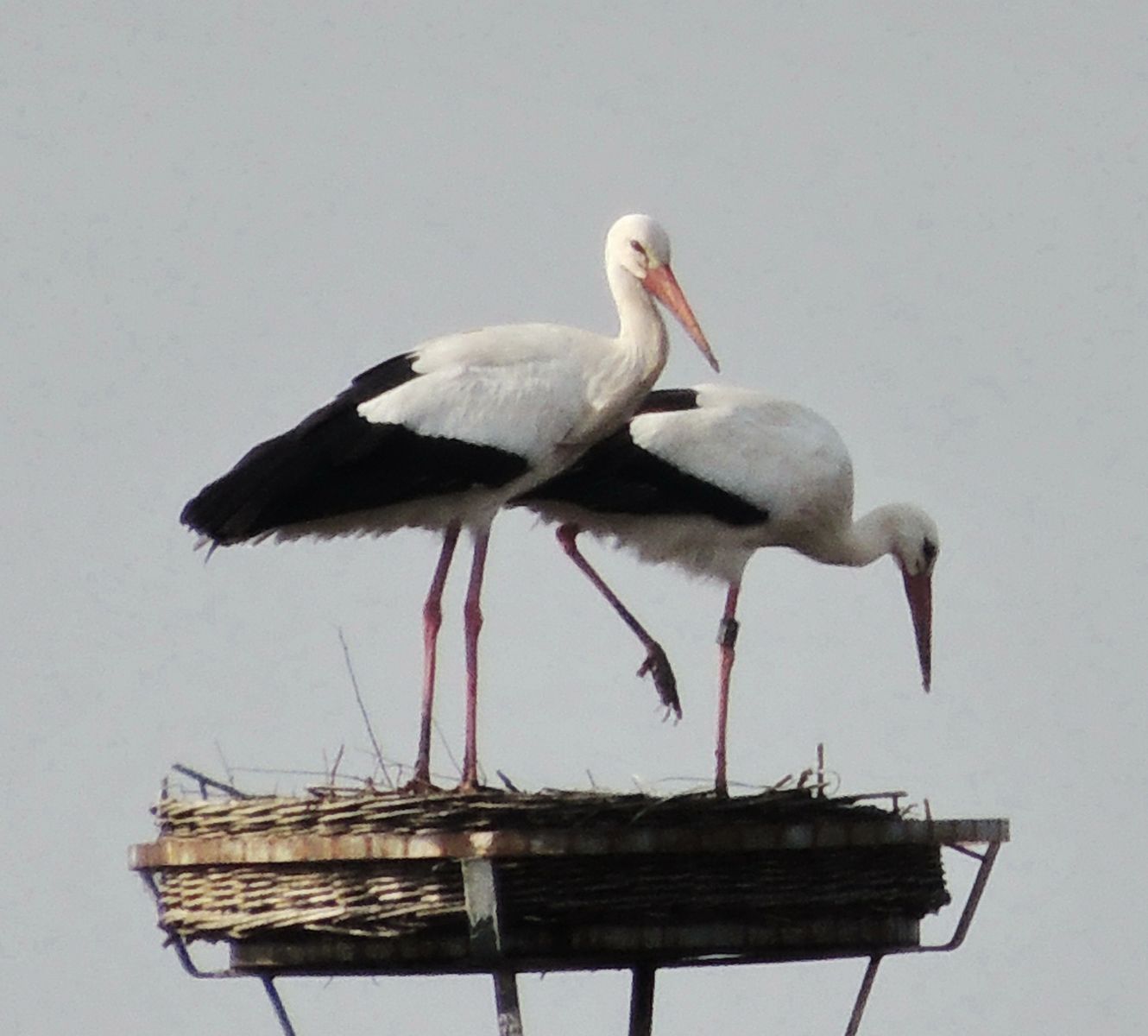 Das Storchenpaar suchte auf  den Ackerflächen am nordwestlichen Rand der Landbachaue und an den Rändern der Wasserflächen nach Nahrung. Zwischendurch wurde immer wieder die Nisthilfe auf dem Gittermast des NABU Pfungstadt für eine kurze Rast angeflogen.