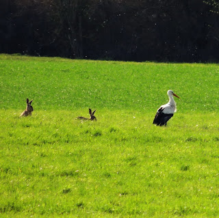 Die immer wieder in der Landbachaue auftauchenden Fremdstörche lösen regelmäßig Alarm bei dem Brutpaar aus. Der gerade nicht brütende Storch fliegt dann auf direktem Weg das Nest an und mit gemeinsamem Abwehrklappern auf dem Nest stehend verteidigt das Paar dann sein Territorium. Wird dann die Vertreibung allzu neugieriger Fremdlinge notwendig, wird dies nach unserer Beobachtung ausschließlich vom männlichen Storch übernommen, während das Weibchen Nest und Gelege beschützt. Anders verhält es sich bei den das Nestgebiet überfliegenden Gänsen und auch Kranichen, die letztmals am 22. April in der Landbachaue beobachtet werden konnten. Diese Vögel werden trotz ihrer Größe von den Störchen offensichtlich nicht als Bedrohung angesehen und einfach ignoriert.