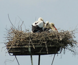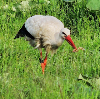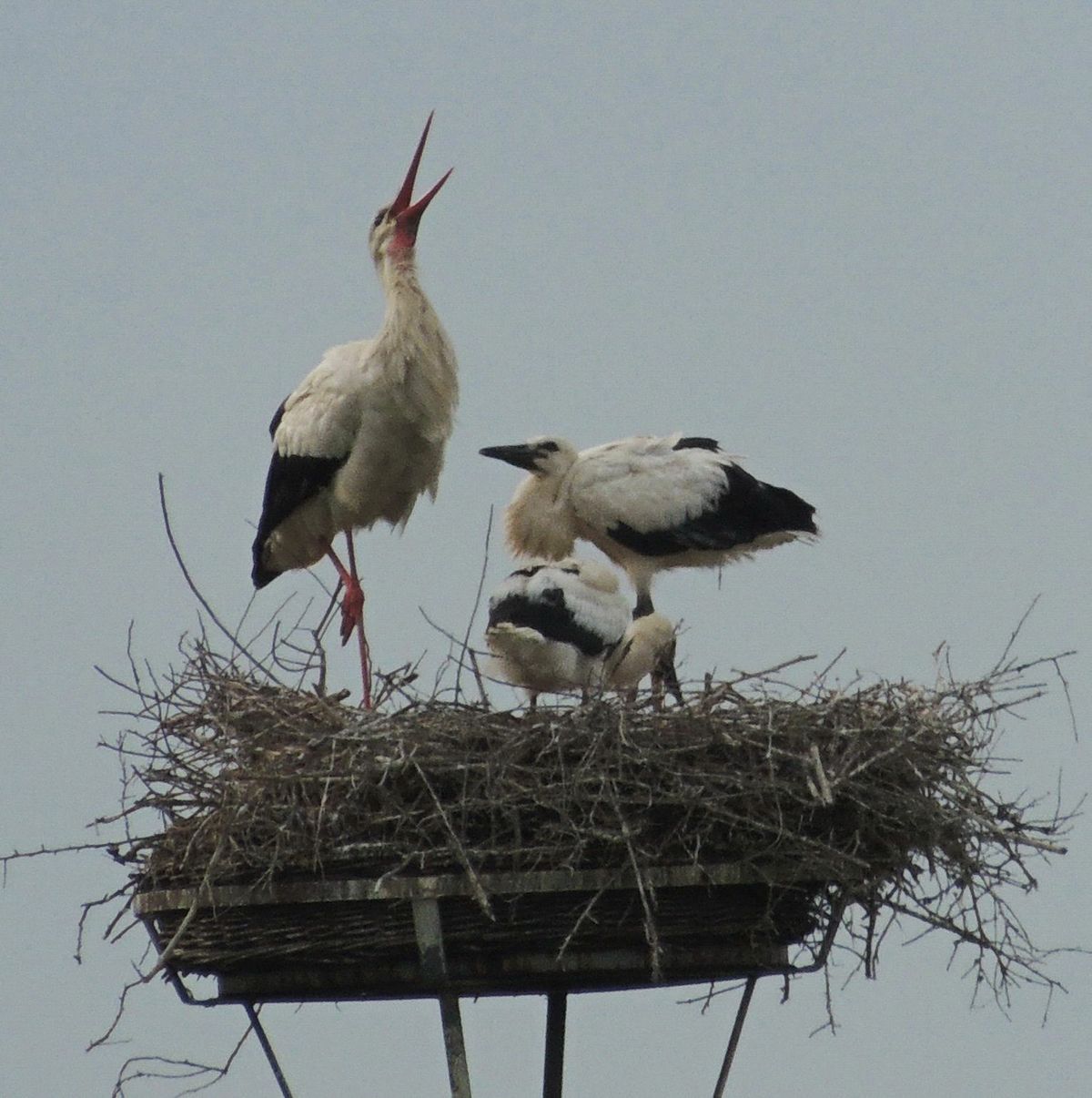 Das nasse Frühjahr hatte den Vorteil, dass im Juni das Nahrungsangebot für die Störche und ihren Nachwuchs ausgesprochen gut war. Hauptsächlich Regenwürmer wurden in der ersten Monatshälfte von den Storcheneltern massenhaft erbeutet und an den Nachwuchs verfüttert. Ab der zweiten Monatshälfte standen dann vermehrt Mäuse und ähnlich große Beute auf dem Speiseplan und sorgten bei den zwei überlebenden Jungstörchen für einen enomen Wachstumsschub, wobei der Größenunterschied aber erhalten blieb.