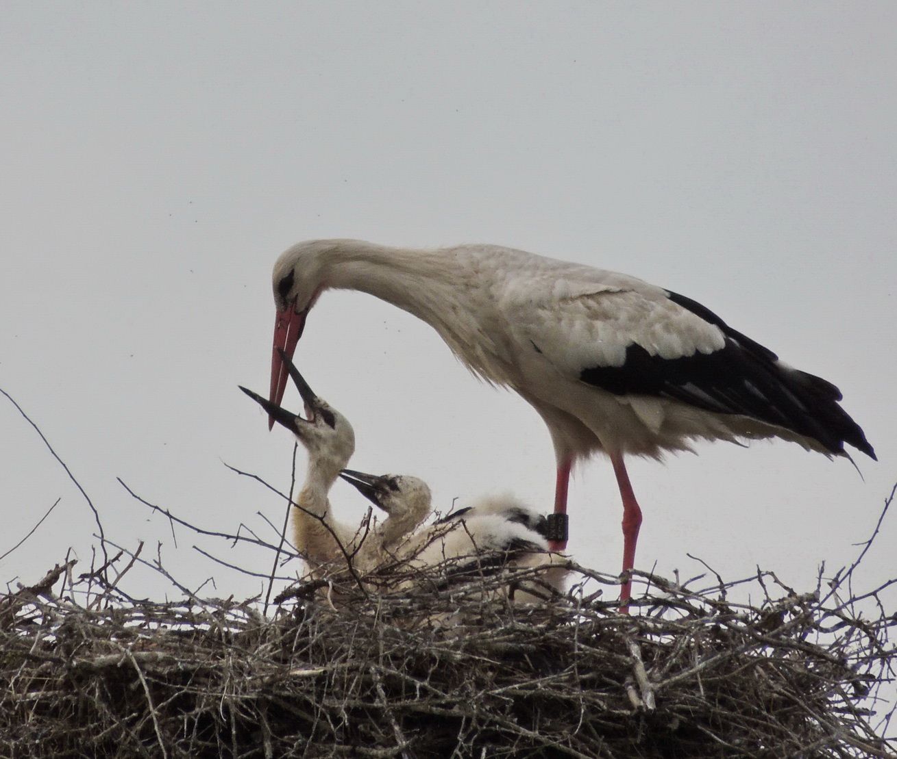 In der letzten Juniwoche, also im Alter von sechs Wochen, wurden die beiden Jungstörche von Klaus Hillerich (NABU Landesarbeitsgruppe Weißstorch) beringt. Diese nur wenige Minuten dauernde Prozedur, bei der die Jungstörche in eine Starre (Akinese) verfallen, haben die Kleinen unbeschadet überstanden und schon nach kurzer Zeit kehrte wieder der Alltag mit Fütterung, Gefiederpflege, dösen und ab und zu mal die immer länger werdenden Flügel strecken, ein.