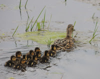 Für die Wasservögel in der Aue waren die schlechtenWetterbedingungen weniger problematisch. Grau-, Kanada- und Nilgänse segelten mit ihrem Nachwuchs über die Wasserflächen, ebenso einige Blässhuhnfamilien. Allerdings waren, wie im Vorjahr auch, wenige Stockentenfamilien zu sichten. Auch die Höckerschwäne haben ihre lange Brutzeit erfogreich abgeschlossen und führen ihre 6 Junge aus.