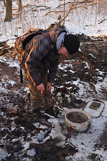 Jan rettet einen Grasfrosch, der die eiskalte Nacht unter der Eisschicht verbracht hatte.