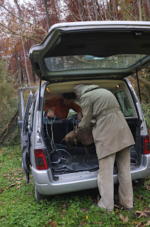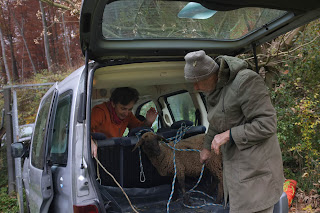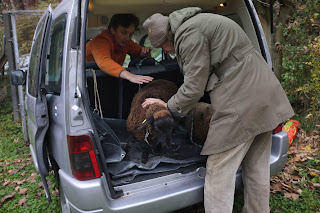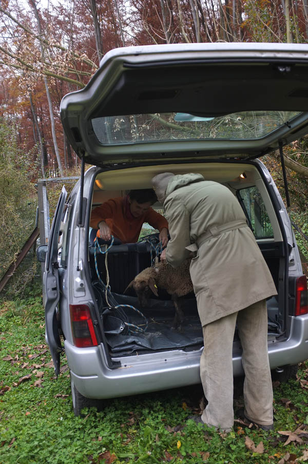Fotos: NABU/Tino Westphal – drei Mutterlämmer hatten die Wühlmäuse ausgewählt am Sonntag letzter Woche – heute wurden sie gekauft und auf die Winterweide auf den Etzwiesen geschafft. Ecki und Zelke binden die Tiere los und geben ihnen ihre Freuheit zurück.