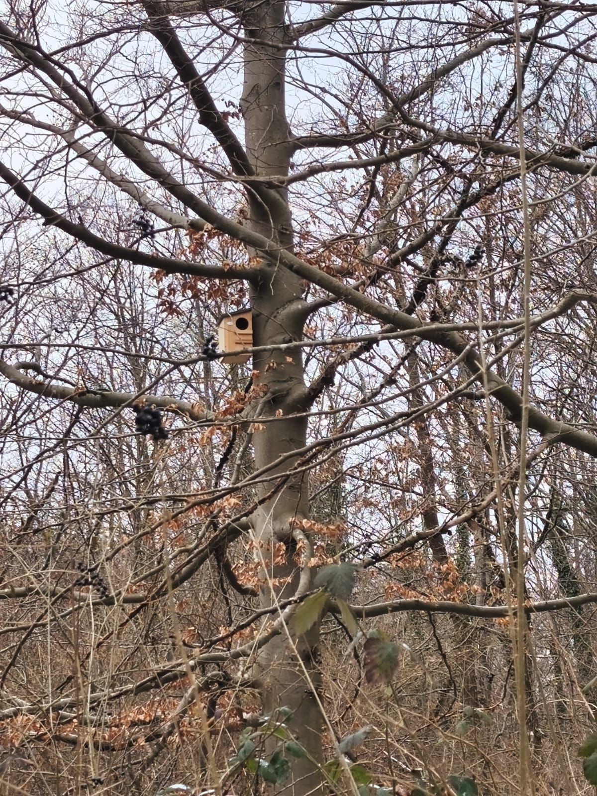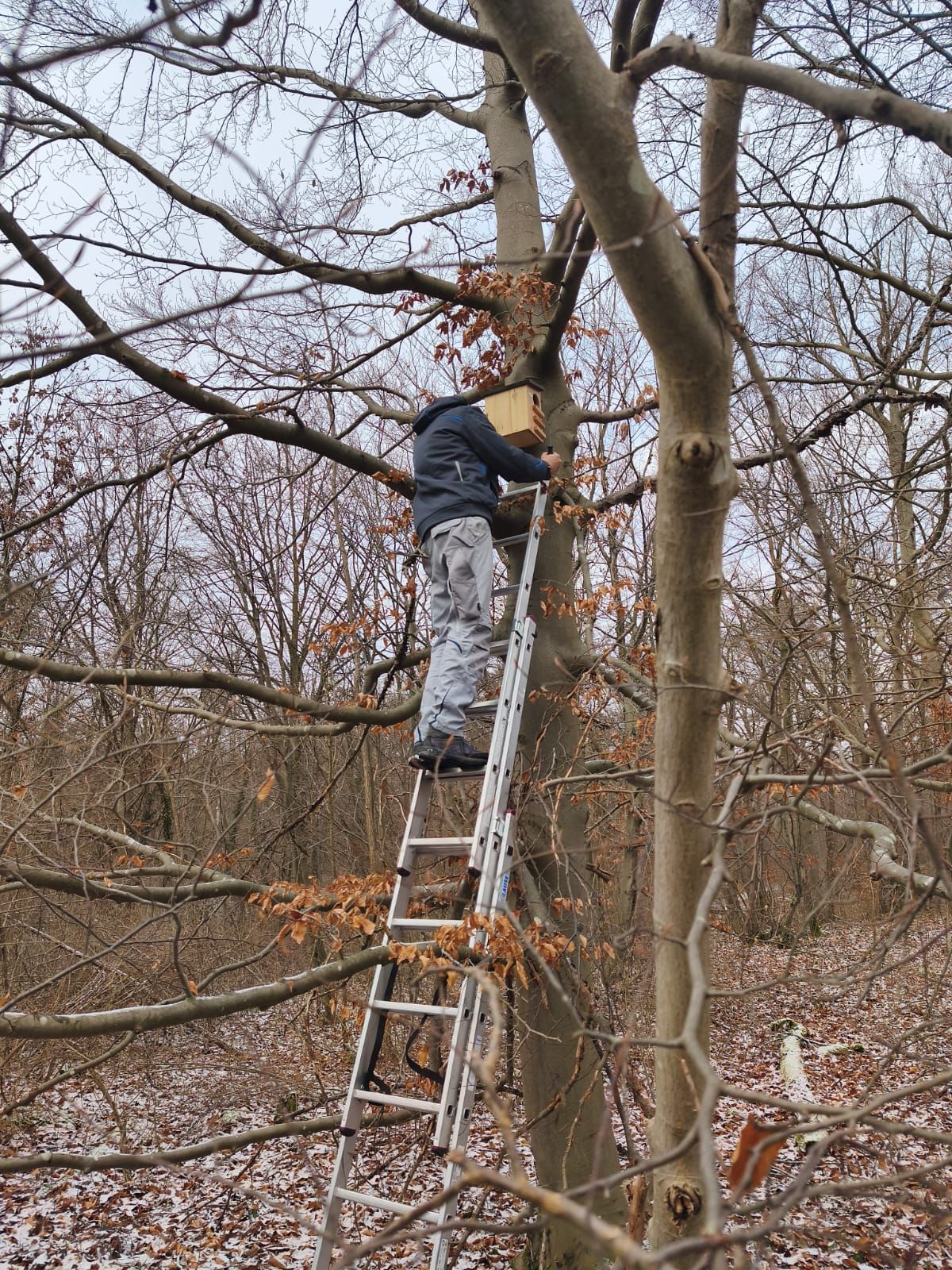 Zwei Eichhörnchenkobel wurden aufgehängt – nahe den Futterstellen, die von NABU-Aktiven regelmäßig mit Winterfutter für Tiere im Wald versorgt werden.