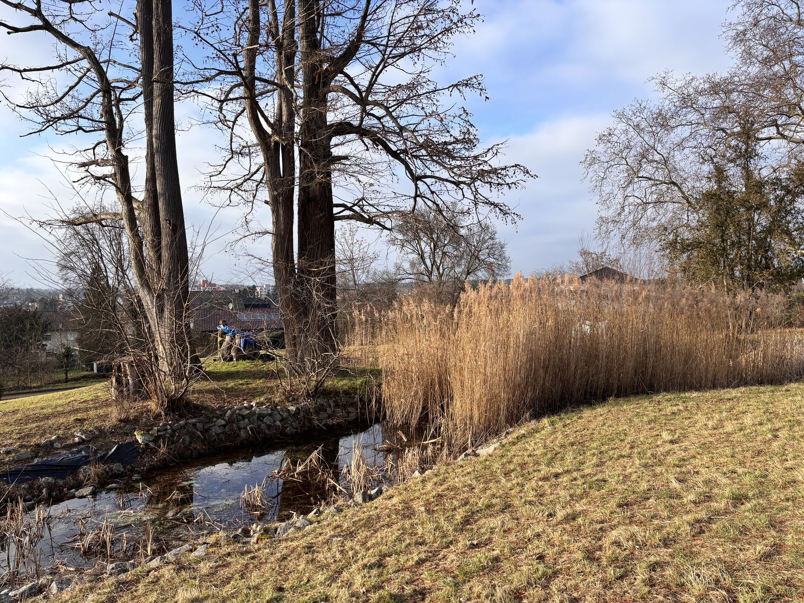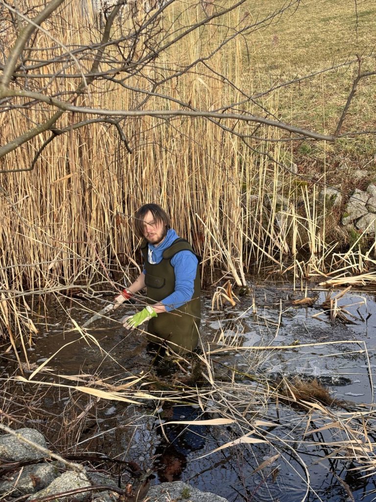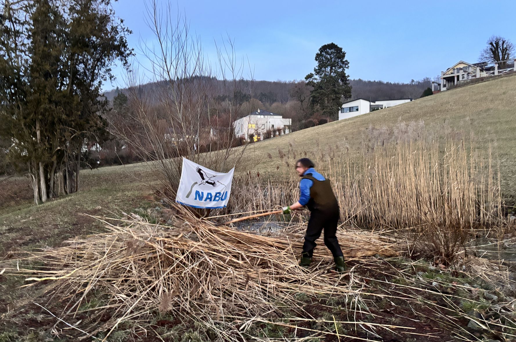 Nachdem das Eis auf dem Schlossteich in Seeheim geschmolzen war, und noch rechtzeitig vor Beginn der Amphibienwanderung, wurde vorjähriges Schilf aus dem Teich geschnitten.