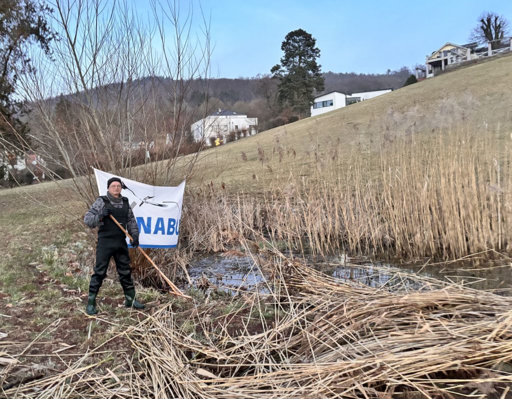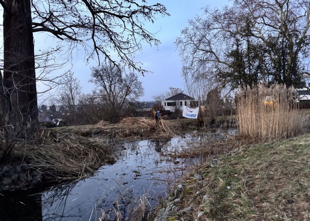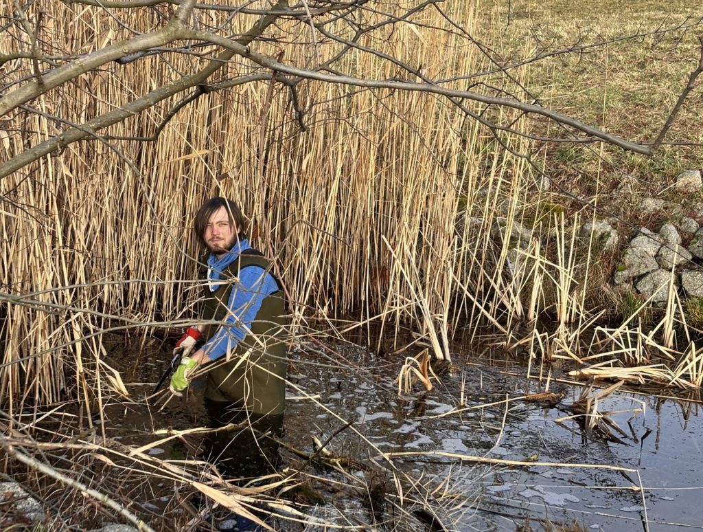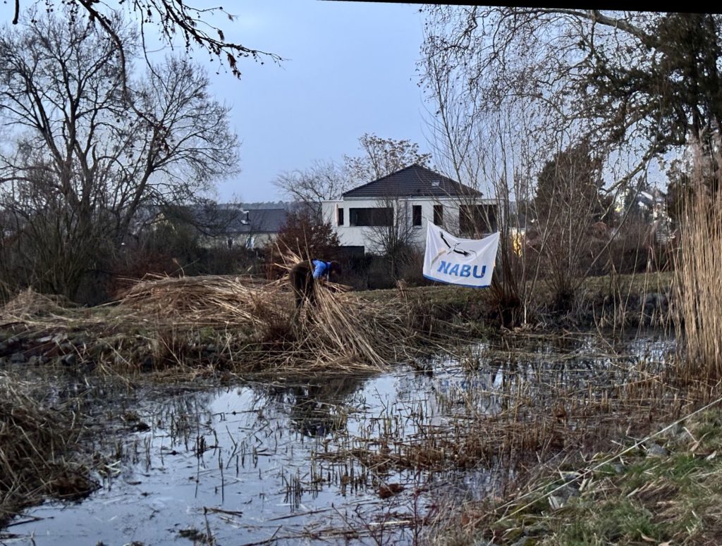 Nachdem das Eis auf dem Schlossteich in Seeheim geschmolzen war, und noch rechtzeitig vor Beginn der Amphibienwanderung, wurde vorjähriges Schilf aus dem Teich geschnitten.