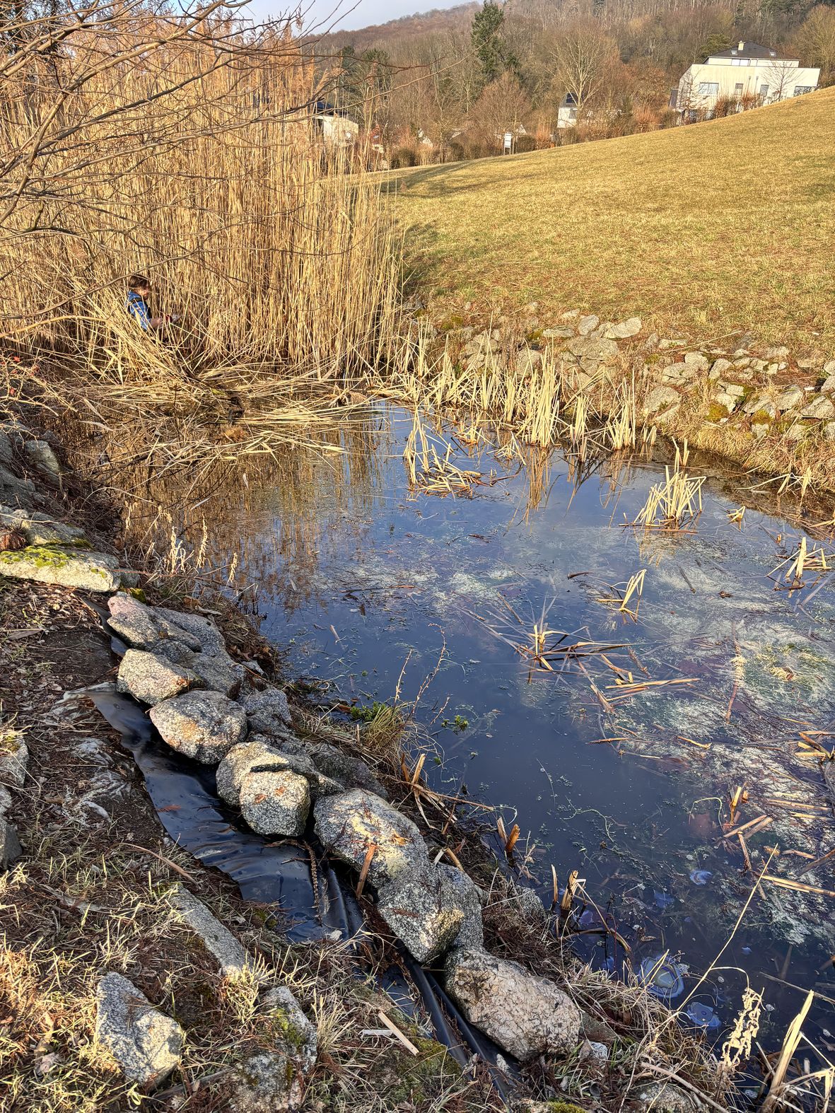 Leider hatten Besucherinnen und Besucher im Winter Teile der Uferabdeckung auf den vereisten Tümpel geworfen. Dadurch wurde die Teichfolie an mehreren Stellen der Böschung freigelegt und beschädigt.