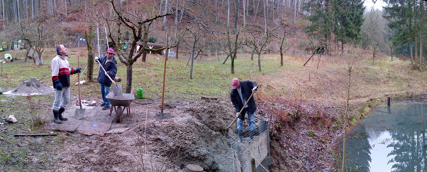 Der NABU-Bautrupp mit Martin, Mahmud, Klaus-Dieter und Tino fügt eine letzte Schicht Schüttbeton in die Bewehrung.