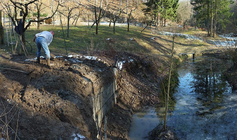Die Verschalung der Eisvogelwand wurde entfernt, die Bruthöhlen vorbereitet und ein Drainagerohr hinter die Böschung gelegt.
