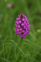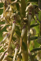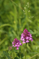Die von Klaus-Dieter Herth gehüteten Orchideen-Wiesen bei Seeheim waren Ziel einer nicht ganz offiziellen NABU Expedition. Endlich war Gelegenheit, sich die versteckten Schätze näher anzusehen, die die NABU-Gruppe Seeheim seit vielen Jahren auf ihren Grundstücken schützt oder in Zusammenarbeit mit dem Grundstücksbesitzern in Pflege genommen hat. Besonders wichtig ist der genau abgestimmte Zeitpunk der Mahd: im August kommen die neuen Blattrosetten der Pyramiden-Orchideen und der Bocksriemenzunge zum Vorschein, die den Winter über der Erde aushalten. Deshalb waren in diesem Jahr nach dem harten Winter einige Verluste zu beklagen. Insgesamt aber hat sich der Bestand in den letzten Jahren sehr erfreulich entwickelt.