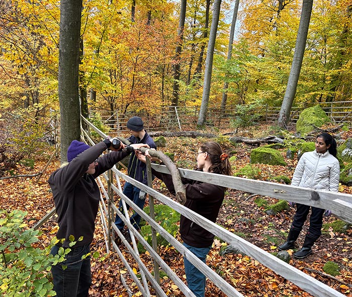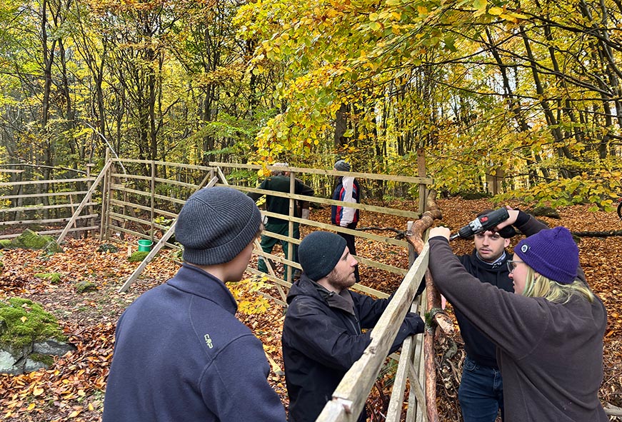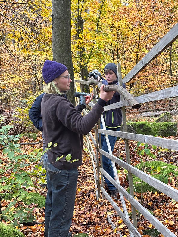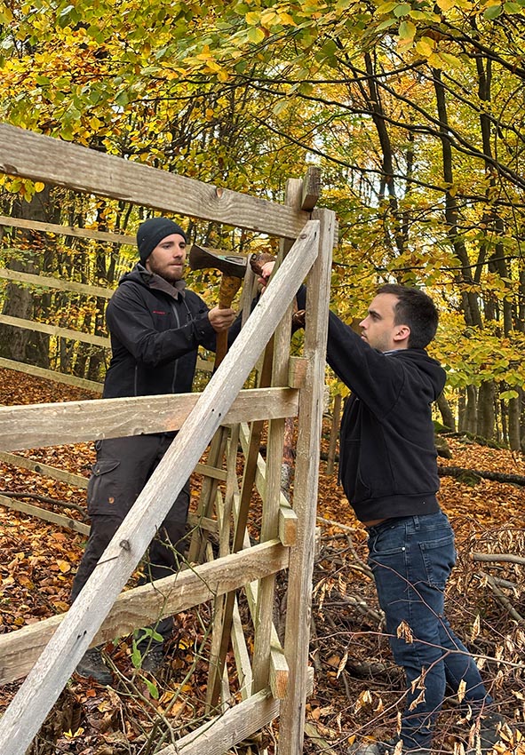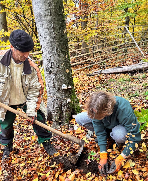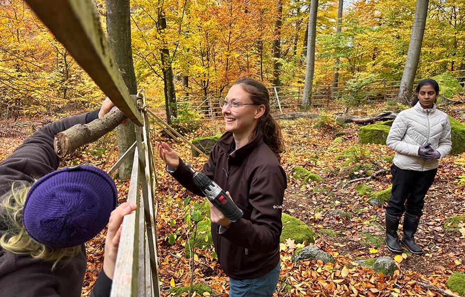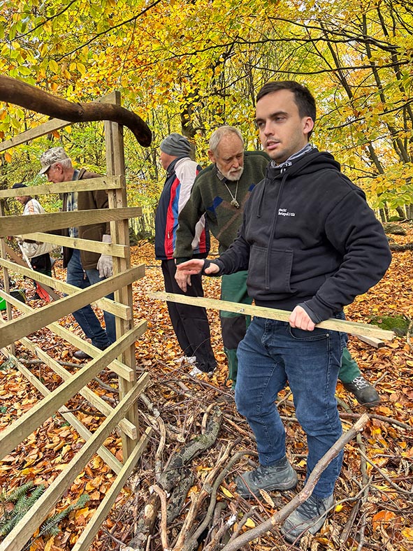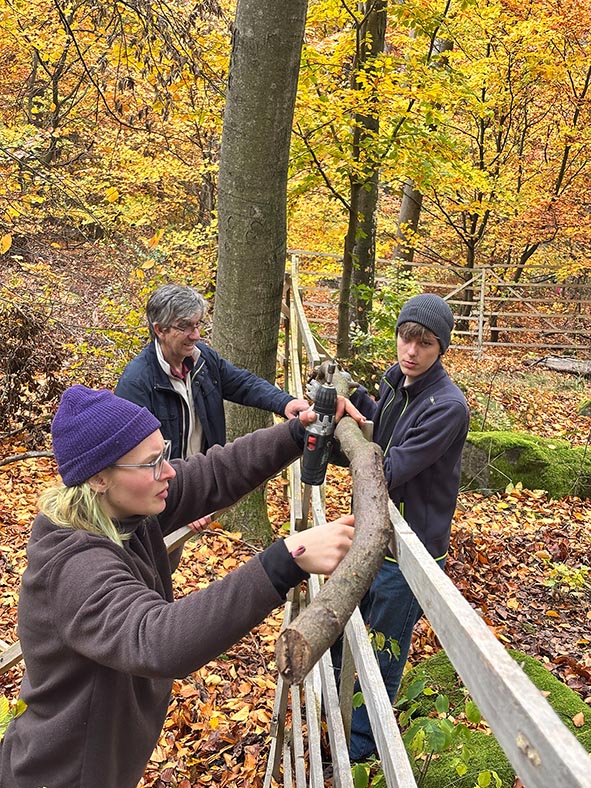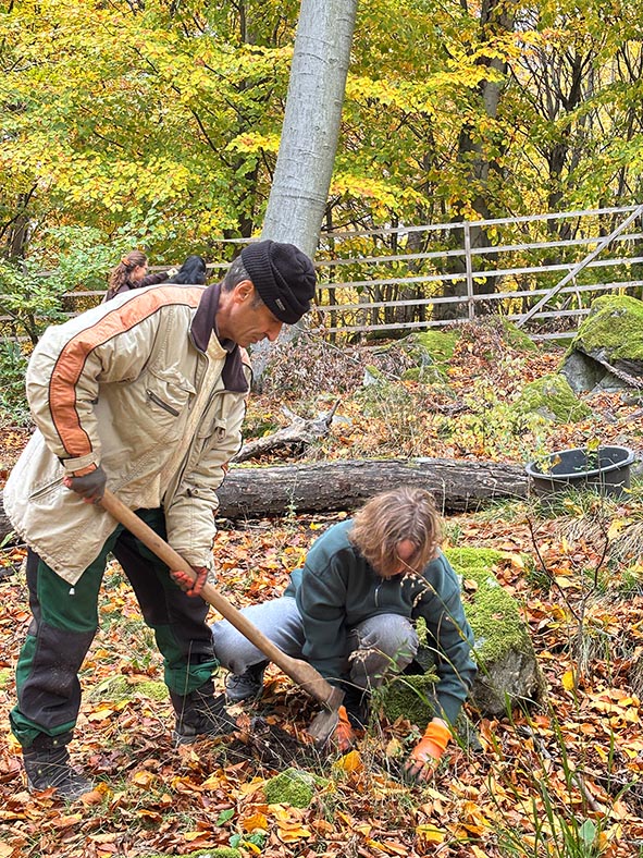 Zum Beginn des Arbeitseinsatzes weist Eki die einzelnen Teams ein: Brombeeren müssen ausgehackt werden, der Wildzaun braucht eine Reparatur, es wird gepflanzt und eingesät.