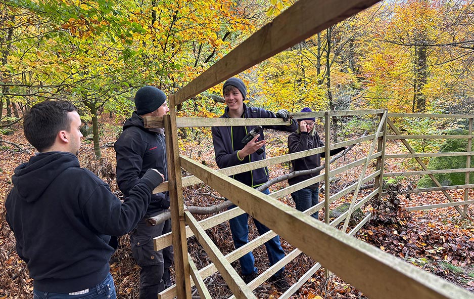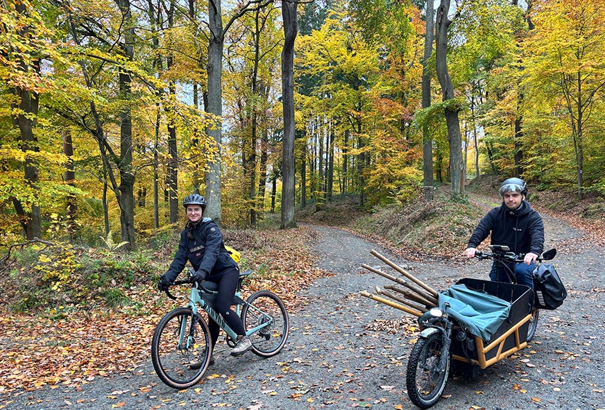 Das Transport-Team mit dem nötigen Werkzeug im Wald am Langen Berg
