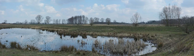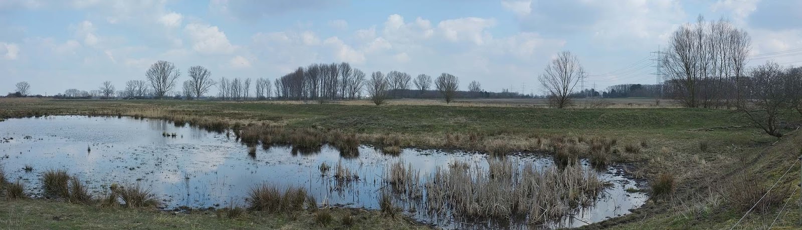 Foto links: Feuchtgebiet Landbachaue im März 2013 – rechts am Horizont Storchenmast des NABU Pfungstadt.