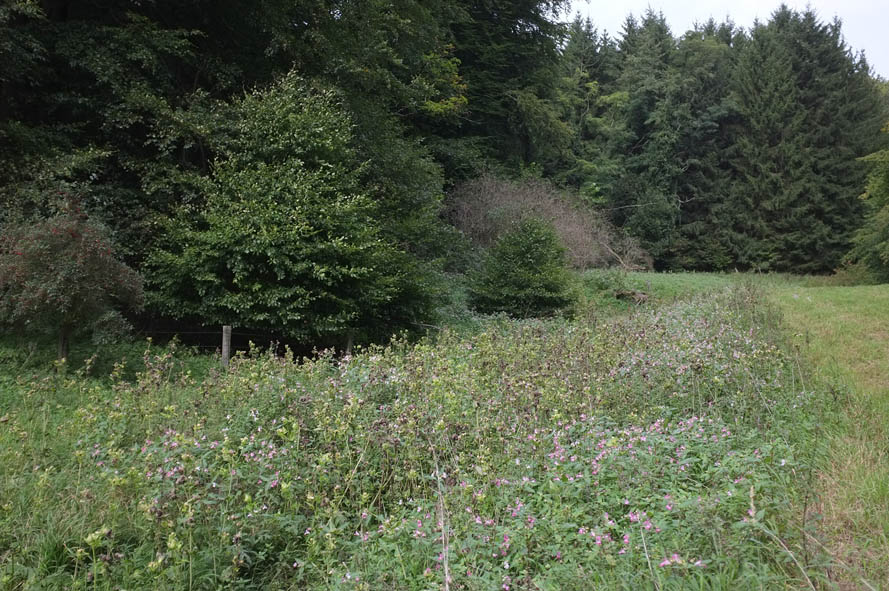 Links: Kleinere Quellgebiete im Talverlauf mit dichten Beständen von Indischem Springkraut und etwas Kohldistel