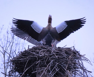 Im Januar 2012 waren erwartungsgemäß noch keine Störche in der Landbachaue zu beobachten. Dafür aber zahlreiche andere Vogelarten von der Amsel bis zum Zwergtaucher, überwiegend aber Gänse, Enten, Silber- und Graureiher. Ab und zu landeten Nilgänse auf dem Storchennest, um seine Eignung als Niststätte zu überprüfen, da Storchennester von diesen Gänsen gerne für ihre eigenen Zwecke genutzt werden.