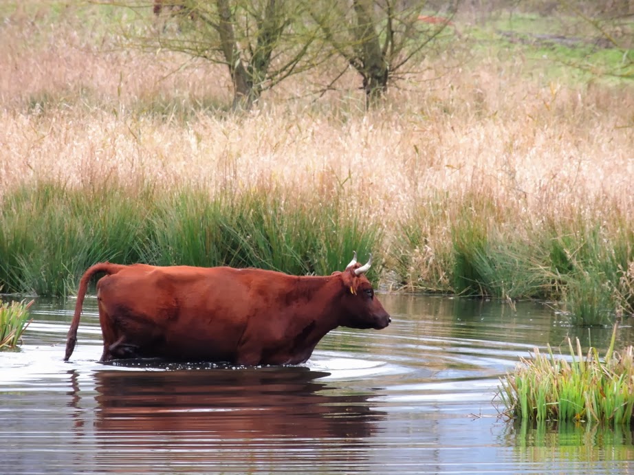 Auch an trüben Novembertagen wird’s in der Landbachaue nicht langweilig. Dafür sorgt schon das Rote Höhenvieh, das trotz den niedrigen Temperaturen bauchtief im Wasser steht, immer auf der Suche fressbarem Grün.