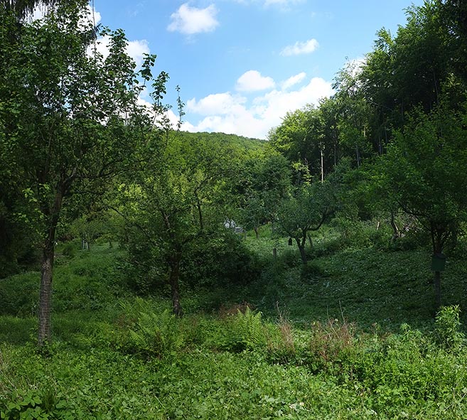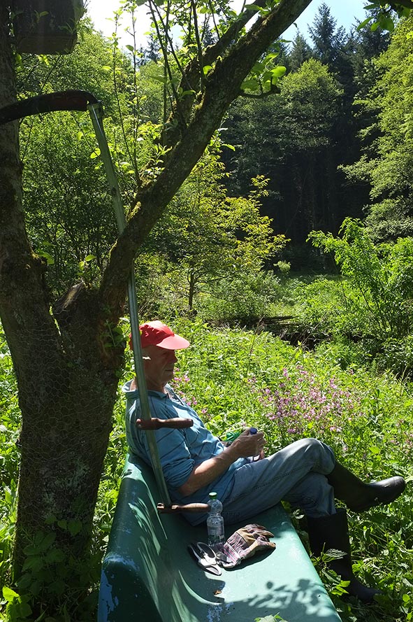Fotos: NABU/Tino Westphal – Nach der Regenperiode sind Brennnesseln und andere Kräuter auf den Etzwiesen hochgeschossen. Mit dem Balkenmäher werden die Flächen gemäht und Wege an den Teichen wieder gangbar gemacht.