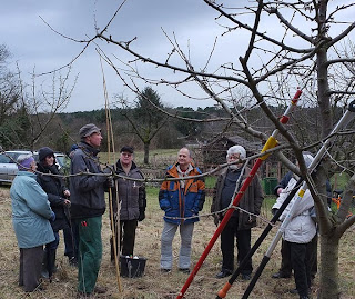 Der letzte praktische Einsatz des NABU-Schnittkurses führt die Teilnehmer an den Blütenhang zwischen Seeheim und Malchen. Auf einem Grundstück der Kirchengemeinde Seeheim werden jeweils ein Apfel-, ein Kirsch und ein Zwetschgenbaum fachgerecht verschnitten. Jeder Schnitt wird sorgfältig erklärt, Varianten mit den Teilnehmern diskutiert.