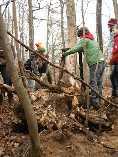 Der Bau ist recht einfach: Man gräbt eine Mulde, in die dann große Baumstümpfe gelegt werden. In die Lücken kommen dann kleinere Baumstümpfe und möglichst dicke Äste. Das Ganze wird zuerst mit Ästen, dann mit Laub abgedeckt, welches zum Schluss mit Ästen vor Sturm geschützt wird. Die Hohlräume der Wurzelburg dienen vielen Tieren als Unterschlupf: Verschiedene Kleintiere, Amphibien, Reptilien, Siebenschläfer, Igel, Hermeline und Mauswiesel, die in Hessen leider noch immer gejagd werden dürfen. Diese Naturschutzeinrichtung wurde von den Wühlmäusen entwickelt, weil in unserer ordentlich auf- und ausgeräumten Landschaft stabile Hohlräume als Unterschlupf für viele Tiere fehlen. Im Herbst werden die Wühlmäuse ihre Wurzelburg noch einmal mit einer neuen Laubschicht abdecken, damit sie den oben genannten Tieren auch als Winterquartier dienen kann.