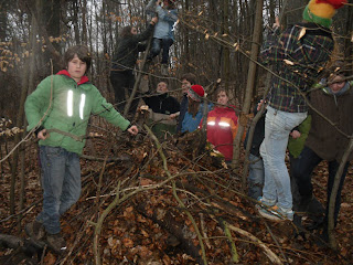 Zur Sternwanderung ist der Lehmofen für die Pizza und Flammkuchenproduktion vorzubereiten: Der Lehmofen wird getrocknet, indem ein kleines Feuer im Inneren unterhalten wird. Am Wühlmausweiher wurde ein Zaun als Schutz gegen einfallendes Laub ausgebaut.