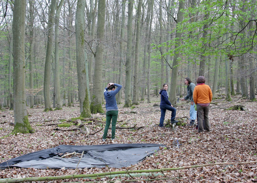 Geübt wurde das Aufstellen einer Dreierkothe: 3 Zeltbahnen werden zusammengeknüpft und an einem Baum hochgezogen. Als Heringe dienen zurechtgeschnittene Äste.