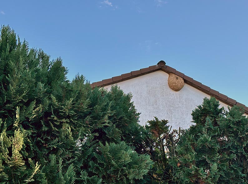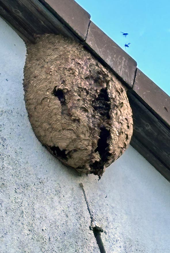 Mitten im Ortsbereich von Malchen versteckt hinter einer hohen Hecke ist in den wenigen Monaten seit August diesen Jahres ein riesiges Nest der Asiatischen Hornisse unter dem Hausgiebel entstanden. Es herrscht reger Flugbetrieb – schon am frühen Morgen sind die großen, dunkel gefärbten Hornissen unterwegs auf Futtersuche. Regelmäßig kann man die Tiere an den Ständen der örtlichen Imker beobachten.