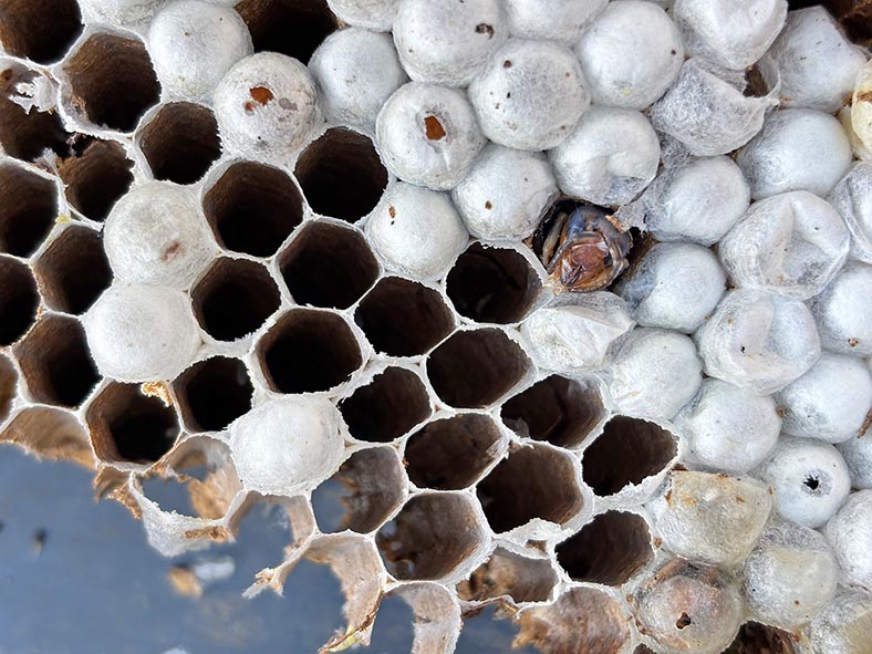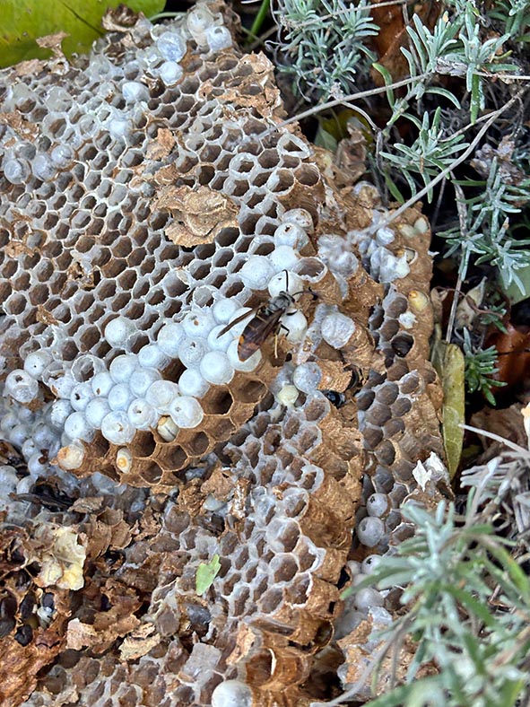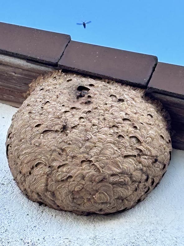 Mitten im Ortsbereich von Malchen versteckt hinter einer hohen Hecke ist in den wenigen Monaten seit August diesen Jahres ein riesiges Nest der Asiatischen Hornisse unter dem Hausgiebel entstanden. Es herrscht reger Flugbetrieb – schon am frühen Morgen sind die großen, dunkel gefärbten Hornissen unterwegs auf Futtersuche. Regelmäßig kann man die Tiere an den Ständen der örtlichen Imker beobachten.