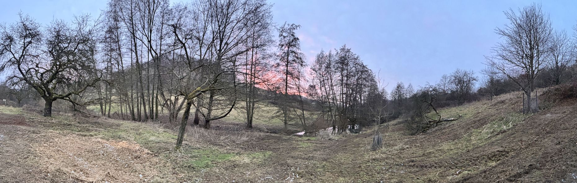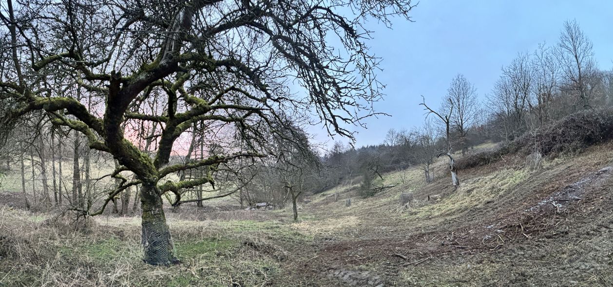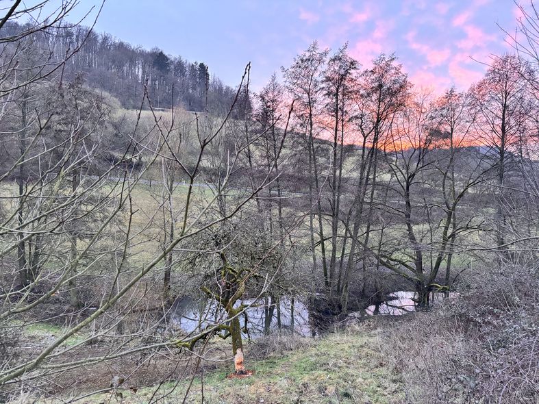 Im NSG Fuchswiese im Stettbacher Tal wurden von Brombeeren überwucherte Flächen gemulcht. Das hat den Biber aber nicht gestört. Er arbeitet weiter daran, die umgefallene Birne in handliche Häppchen zu zerlegen und zum Bau abzutransportieren.