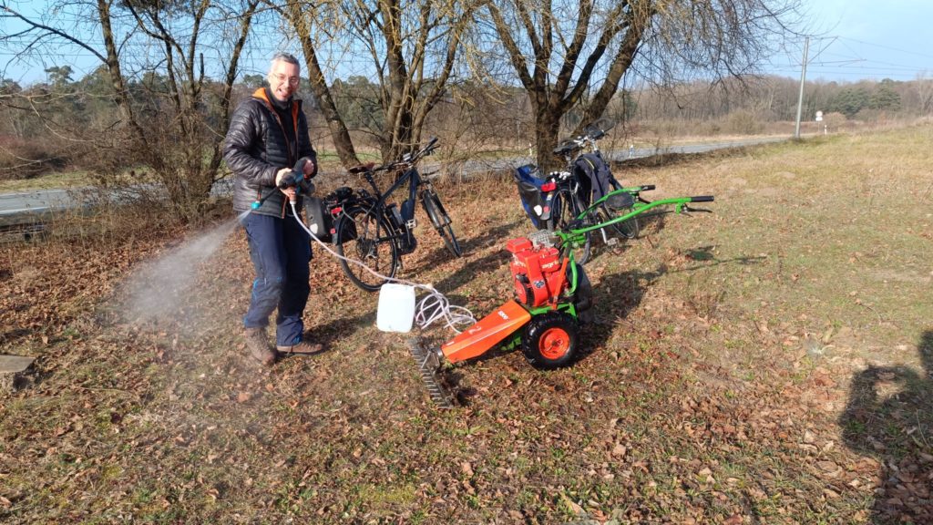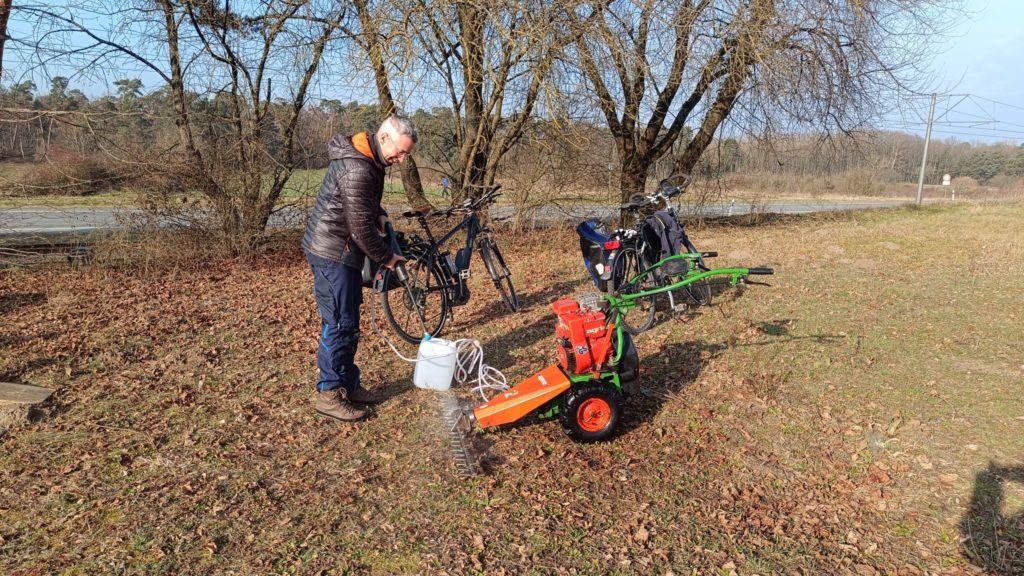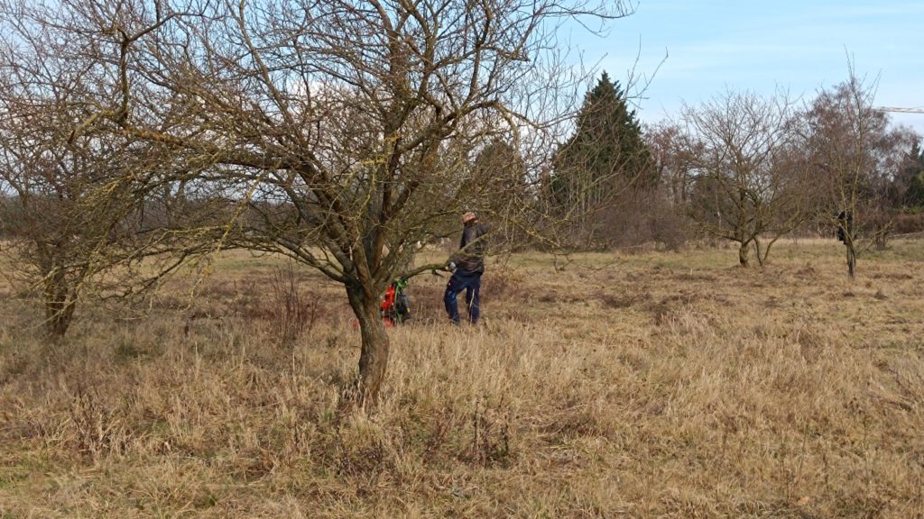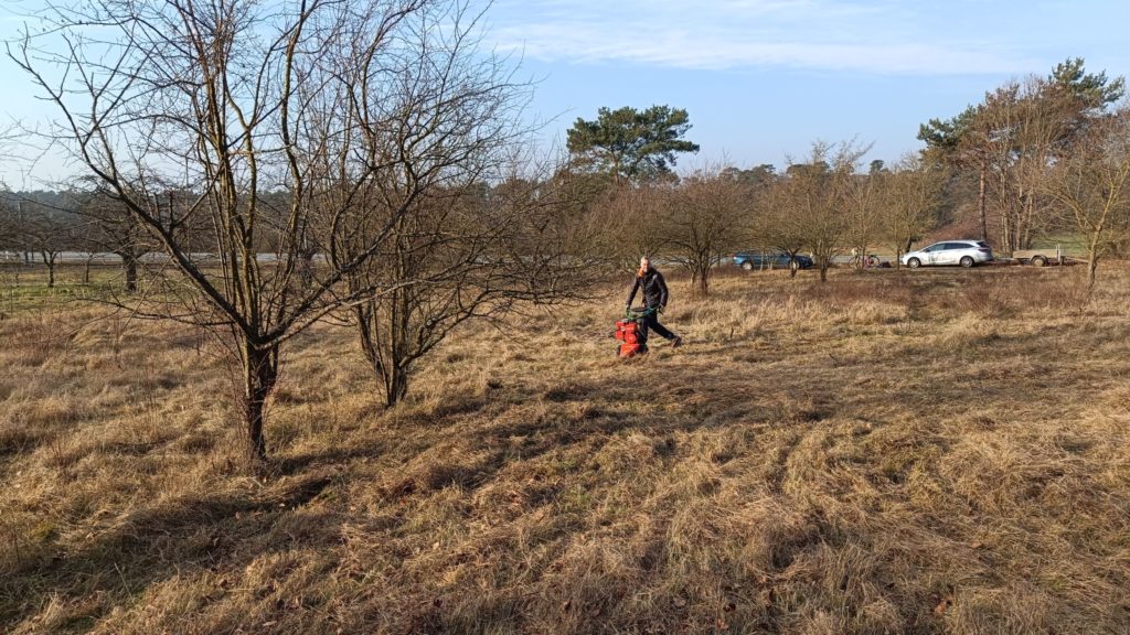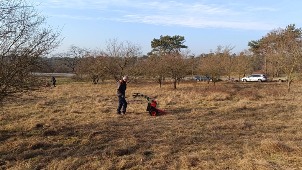 Bei bestem Winter-Sonnenwetter trafen sich sieben NABU-Aktive, um eine Wiese südlich von Malchen zu mähen. Dort hat sich in den letzten Jahren nicht zuletzt durch unsere Pflege ein schönes Vorkommen des seltenen Gelben Zahntrostes (Odontites luteus) entwickelt. Es handelt sich um eine halb-parasitäre Pflanze, die Wasser und Nährstoffe von Wirtspflanzen bezieht, daneben aber auch Photosynthese betreibt. Da sie einjährig ist, ist die Reifung der Samen, die erst sehr spät im Jahr stattfindet, für den Fortbestand der Pflanze entscheidend. Deswegen ist hier weder Schafbeweidung noch Mahd zu normalen Jahreszeiten angesagt. Aber auf diesen trockenen, flachen Standorten ist eine Mahd im Winter gar kein Problem.