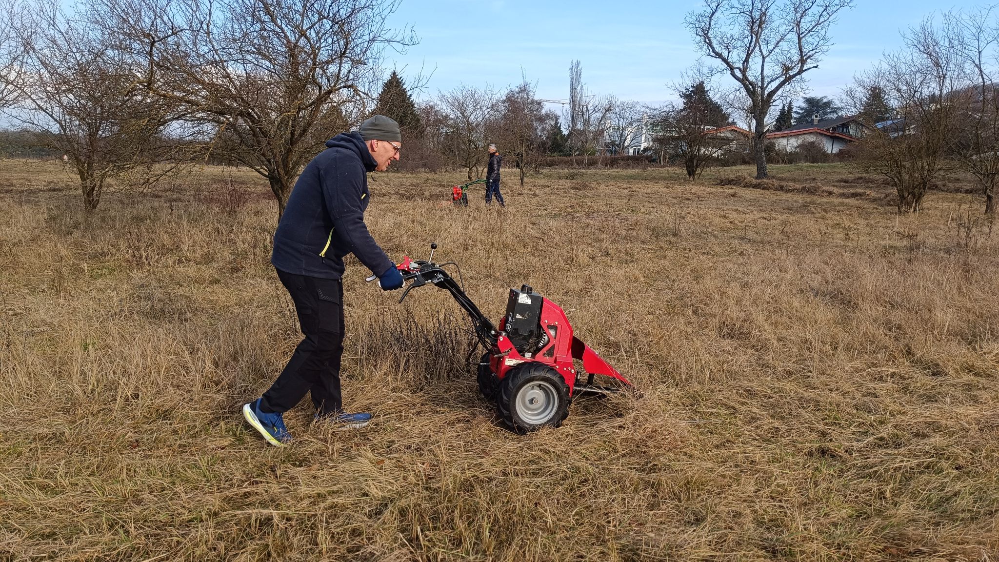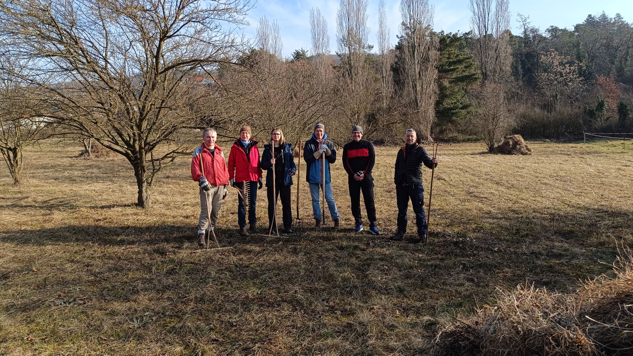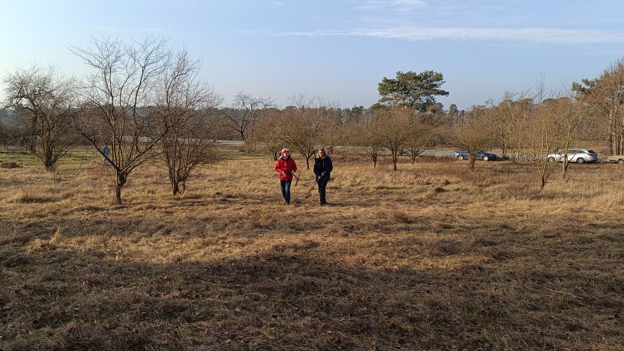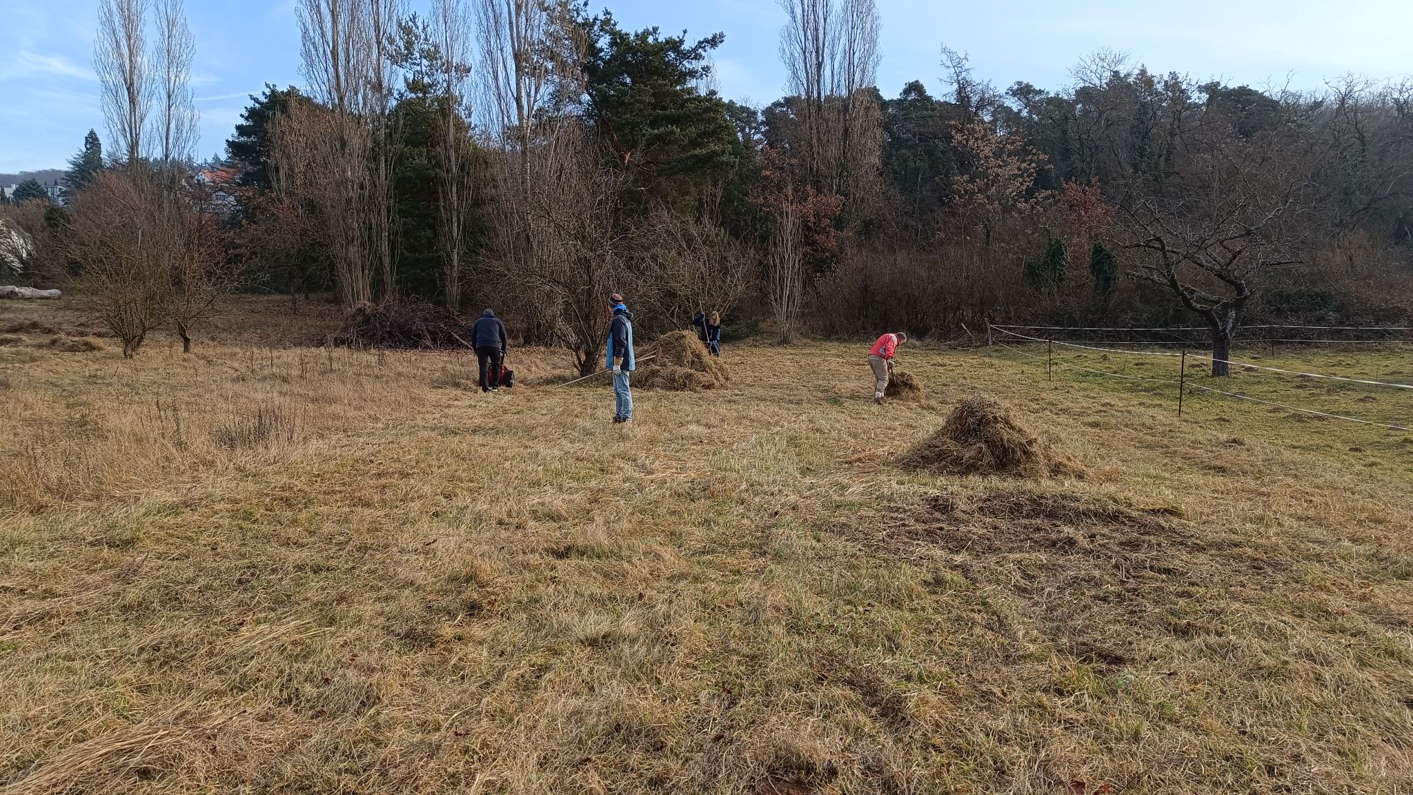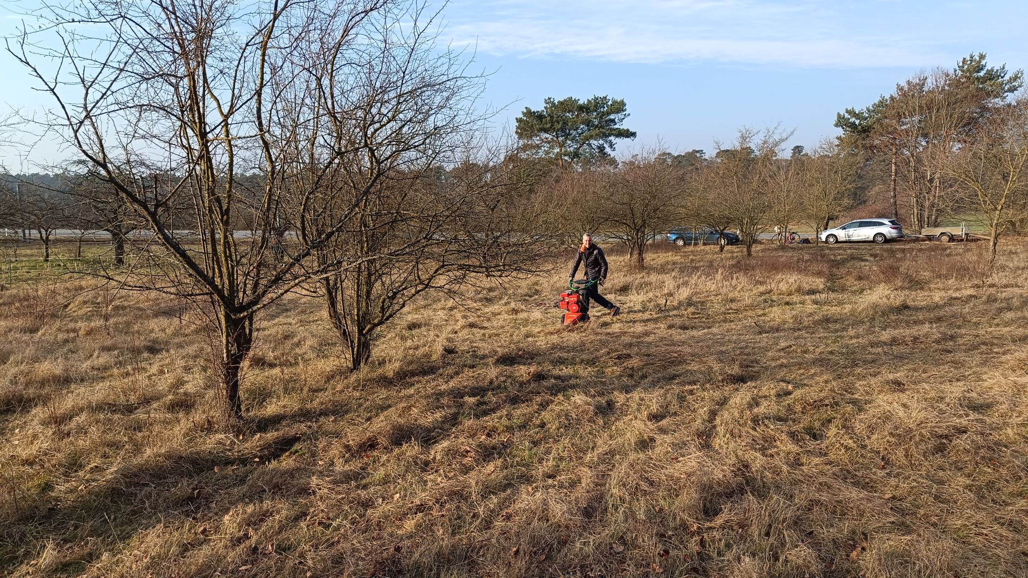 Bei bestem Winter-Sonnenwetter trafen sich sieben NABU-Aktive, um eine Wiese südlich von Malchen zu mähen. Dort hat sich in den letzten Jahren nicht zuletzt durch unsere Pflege ein schönes Vorkommen des seltenen Gelben Zahntrostes (Odontites luteus) entwickelt. Es handelt sich um eine halb-parasitäre Pflanze, die Wasser und Nährstoffe von Wirtspflanzen bezieht, daneben aber auch Photosynthese betreibt. Da sie einjährig ist, ist die Reifung der Samen, die erst sehr spät im Jahr stattfindet, für den Fortbestand der Pflanze entscheidend. Deswegen ist hier weder Schafbeweidung noch Mahd zu normalen Jahreszeiten angesagt. Aber auf diesen trockenen, flachen Standorten ist eine Mahd im Winter gar kein Problem.