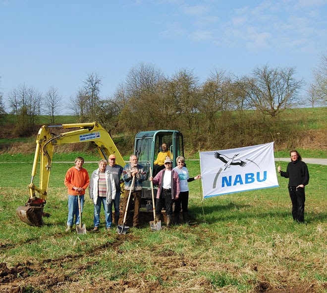 Über 20 aktive Mitarbeiter vor Ort erlebten bei schönstem Frühlingswetter den Bagger-Event am künftigen Weiher am Beerbach.