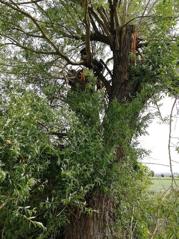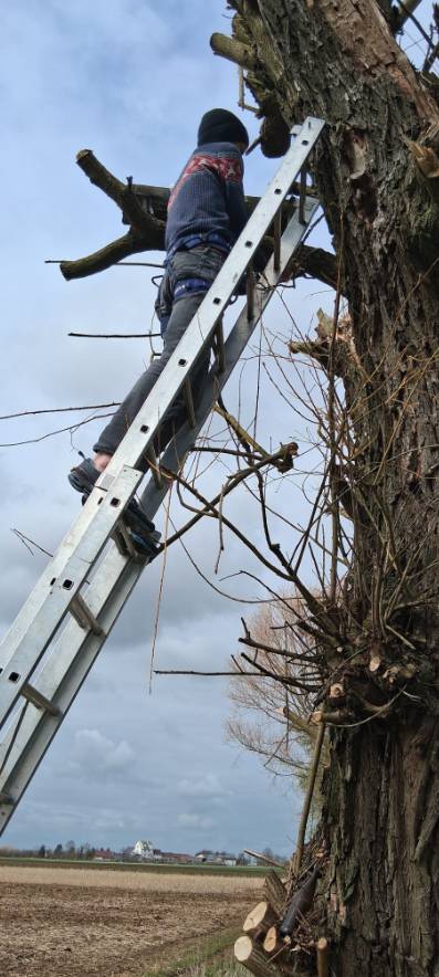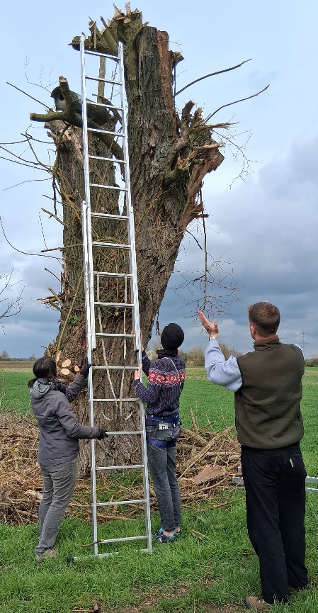 Bei den jährlichen Kontrollen der Steinkauzröhren im hessischen Ried führte der Weg der Gruppe an eine mächtige alte Weide. Diese diente als Unterlage für einen Nistkasten, war jedoch mit abgebrochenen Ästen so umgeben, dass keine Leiter sicher angelegt werden konnte. Der Baum wurde zunächst auf der Kontrollliste als „Sonderfall“ vermerkt – eine Aufgabe für den hauseigenen „Bergsteiger“ Jakob Hey.