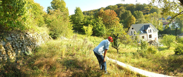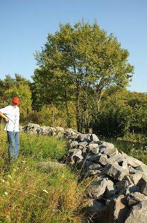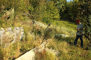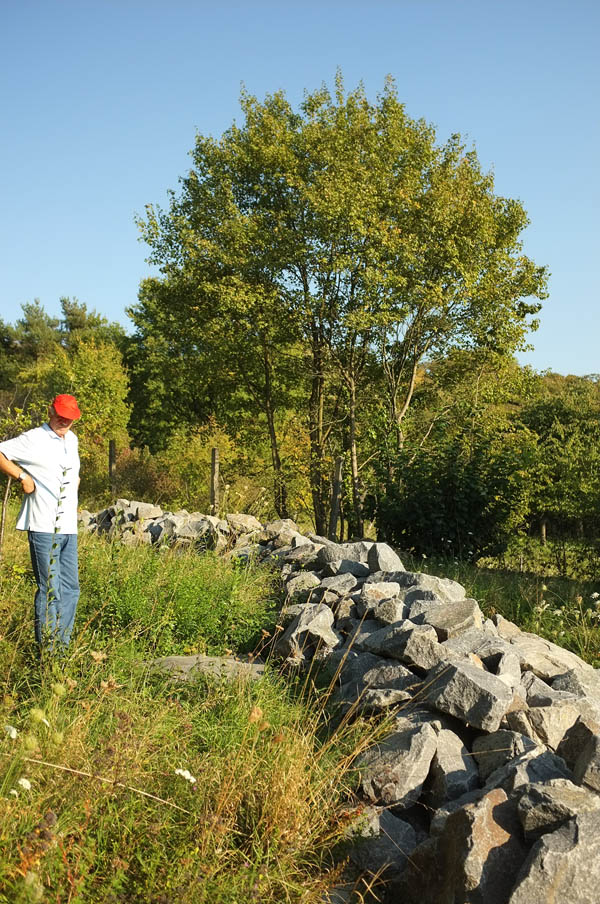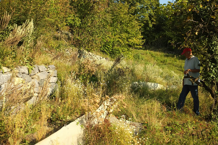 Bild rechts: Steinwall auf dem NABU-Gelände oberhalb des Baugebietes – ein idealer Überwinterungsort für die Schlingnatter, die sich jetzt schon zurückgezogen hat